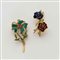 Due spille in oro giallo e smalti, in una piccoli rubini rossi, l'altra due...