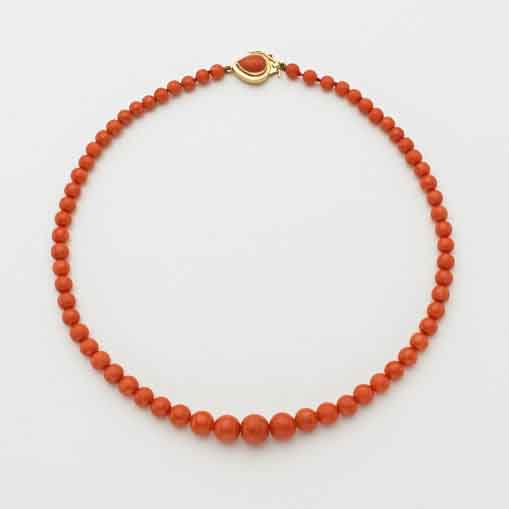 Collana di corallo arancione/rossastro mediterraneo con boules rotonde a scalare da 6 a 12,50 mm circa con chiusura in oro giallo e cabochon sempre di corallo a forma di goccia lunghezza cm 49 g. 47,50 Mediterranean orange/red coral necklace. Gold and coral clasp