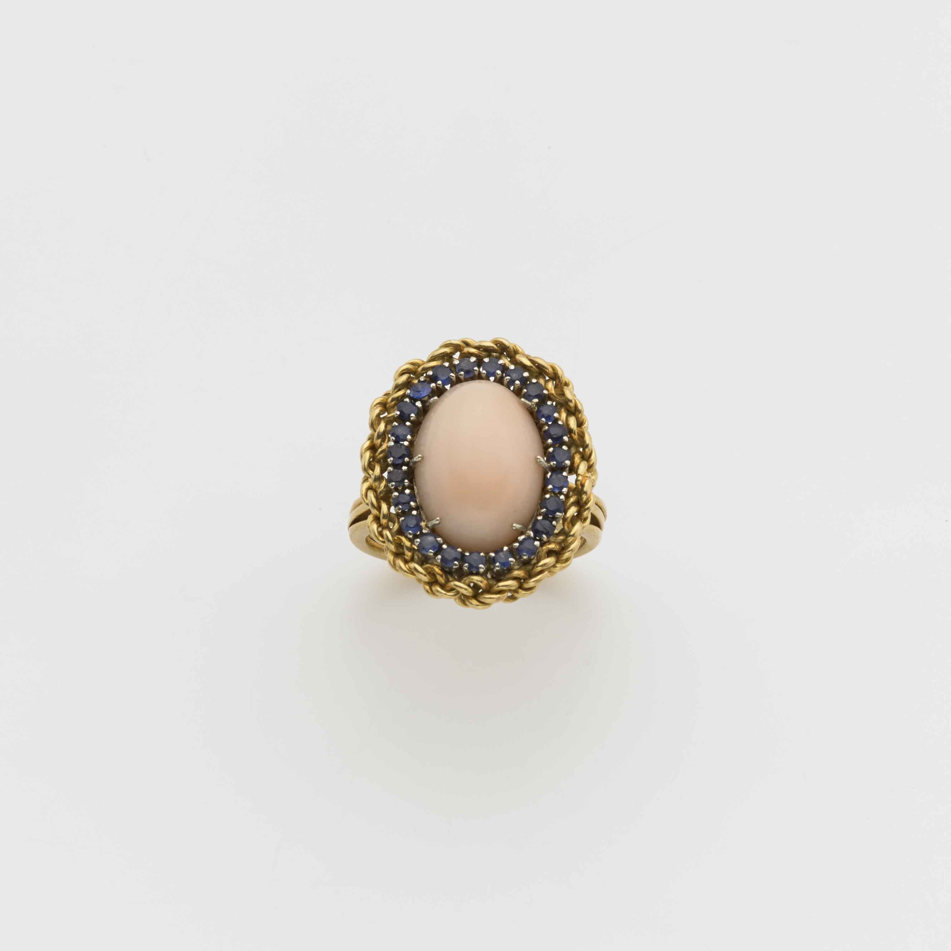 Anello in oro giallo e bianco con al centro un corallo ovale cabochon contornato da zaffiri rotondi g. 9,40, misura 14/54 Yellow and white gold ring with central oval coral cabochon and surrounding sapphires