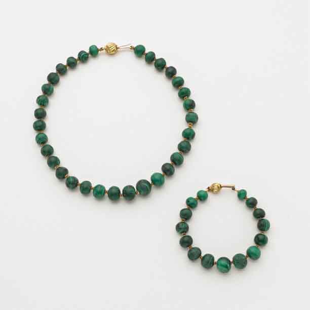 Demi-parure di boules scalate di malachite con chiusura e distanziatori in oro giallo, collier lungh. 40cm, bracciale cm19, complessivi g.123,40 Demi-parure comprising a malachite necklace and bracelet with gold clasp and spacers