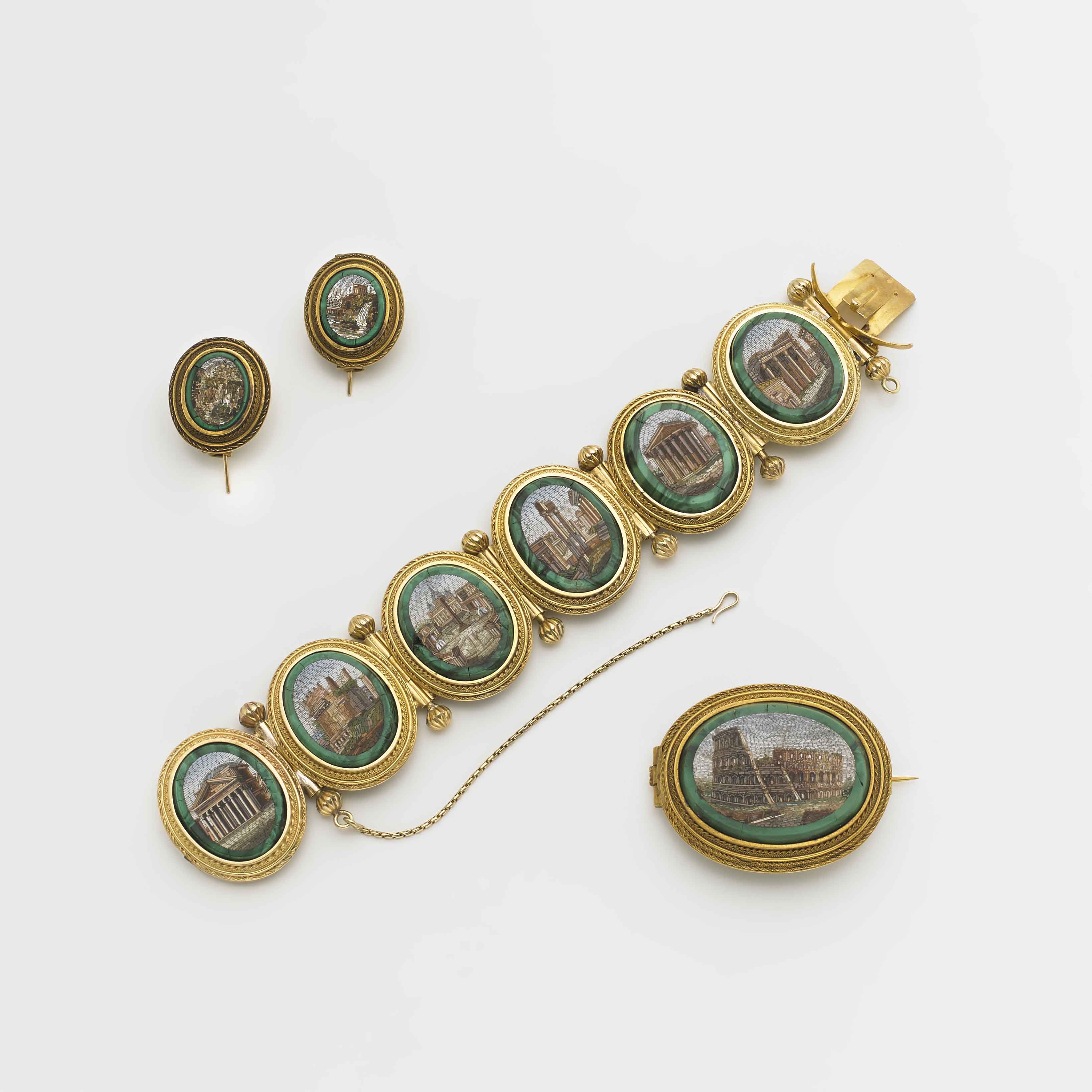 Demi-parure in oro giallo con micromosaico su malachite con raffigurazioni di monumenti romani, composta da: bracciale, spilla ed orecchini, catena di sicurezza, complessivi g. 107,60. Punzone clericale Gold demi-parure with micro-mosaic on malachite comprising a bracelet, a brooch, and earrings