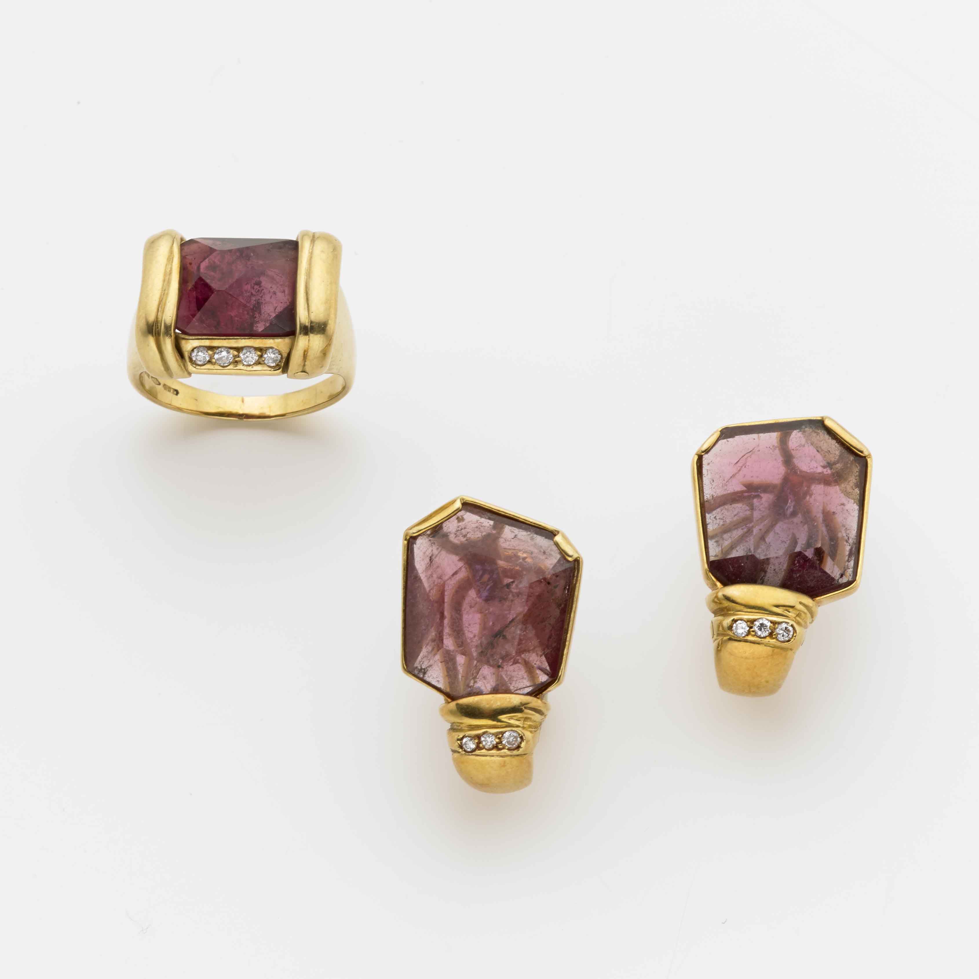 MISANI PER BALESTRA Demì-parure in oro giallo con diamanti rotondi taglio a brillante e tre ametiste di forma e taglio fantasia, complessivi g. 30,90 misura anello 13/53. Con astuccio MISANI PER BALESTRA Gold demi-parure with diamonds and three amethysts