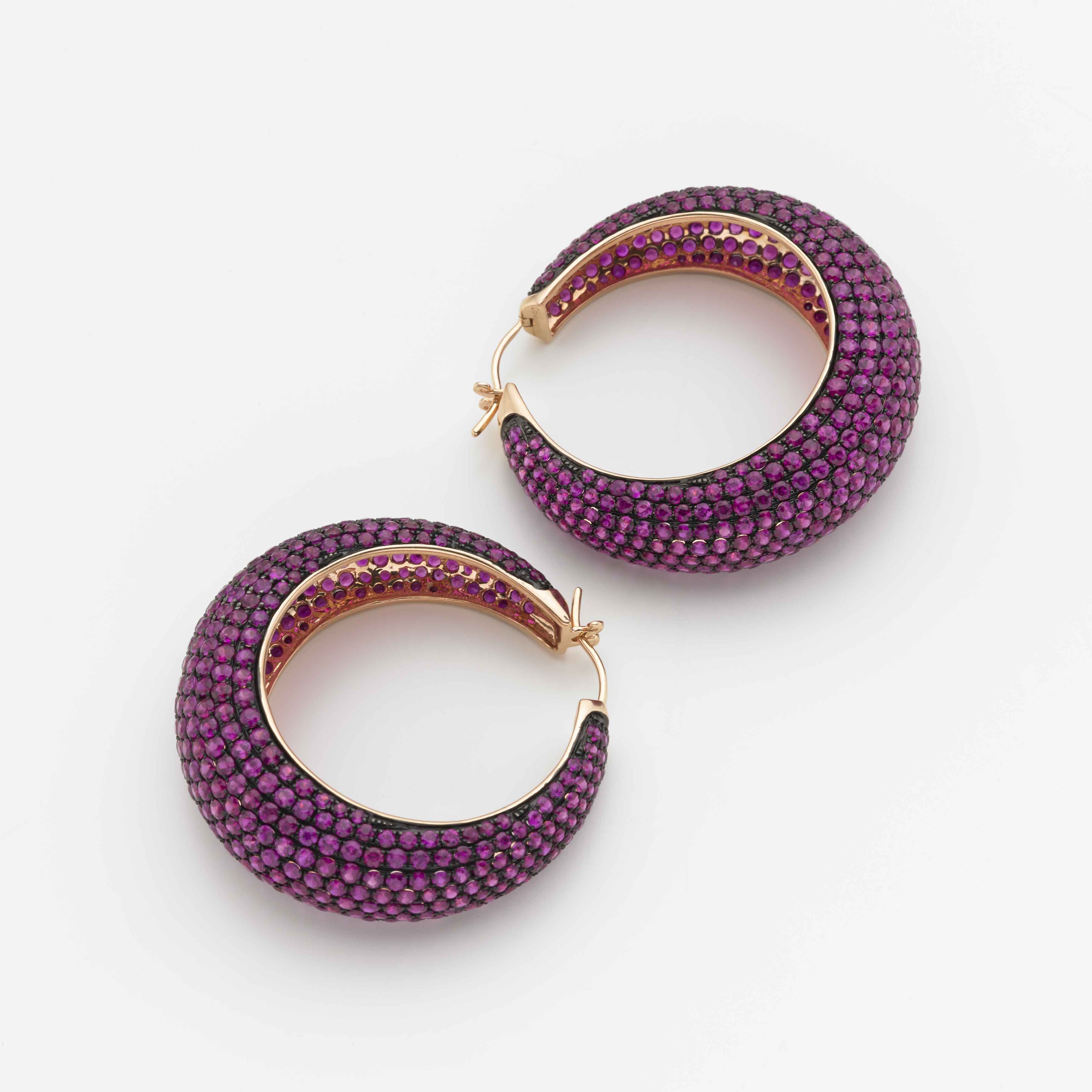 Orecchini pendenti in oro rosa a cerchio bombato con pavè di rubini rodiato nero ct 22 circa g. 17,60 Rose gold drop hoop earrings with ruby pavé