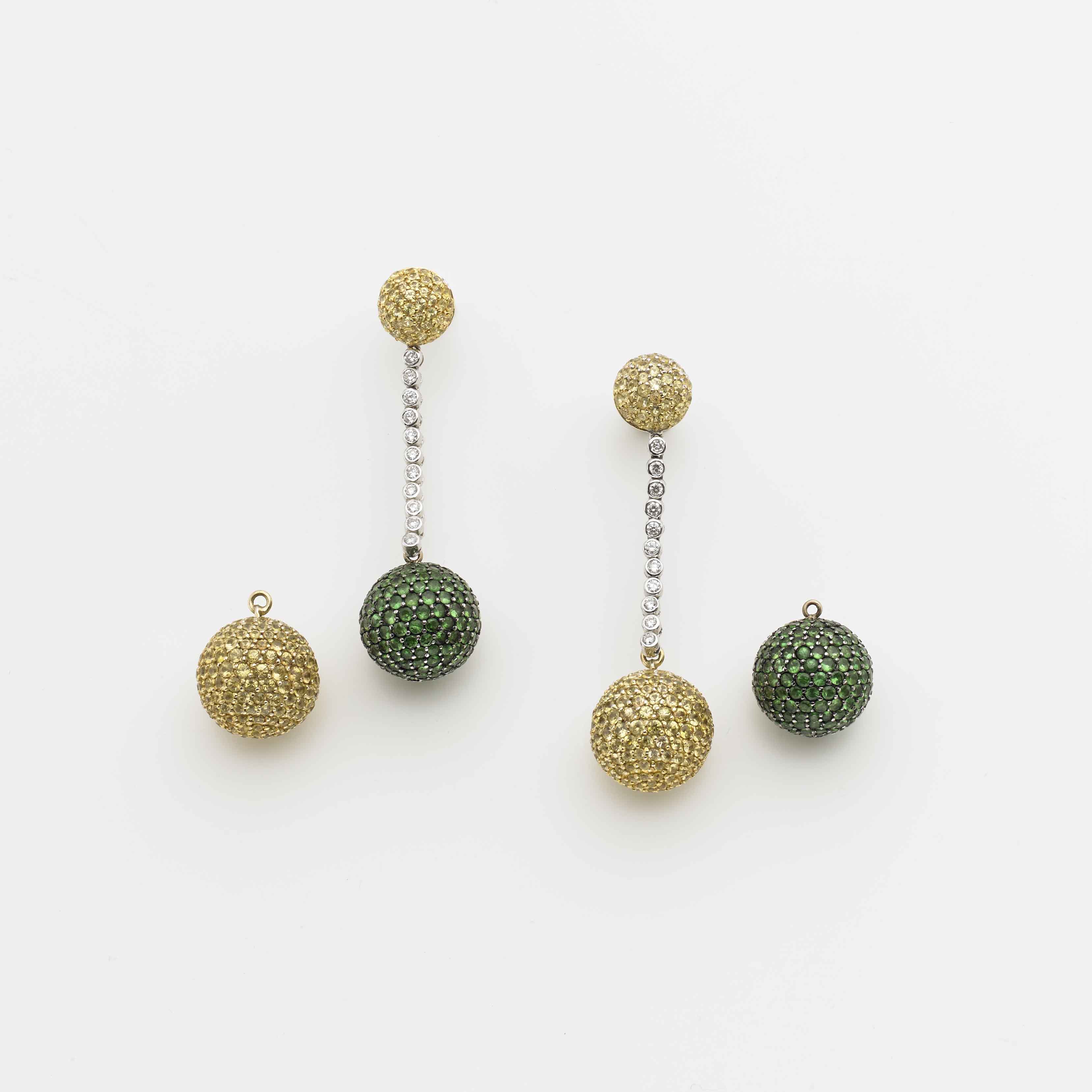 Orecchini pendenti in oro bianco e radiato nero con diamanti, zaffiri gialli e paste vitree verdi. Le boules finali sostituibili, g.39,30 White and rhodium-plated gold earrings with diamonds, yellow sapphires and vitreous paste