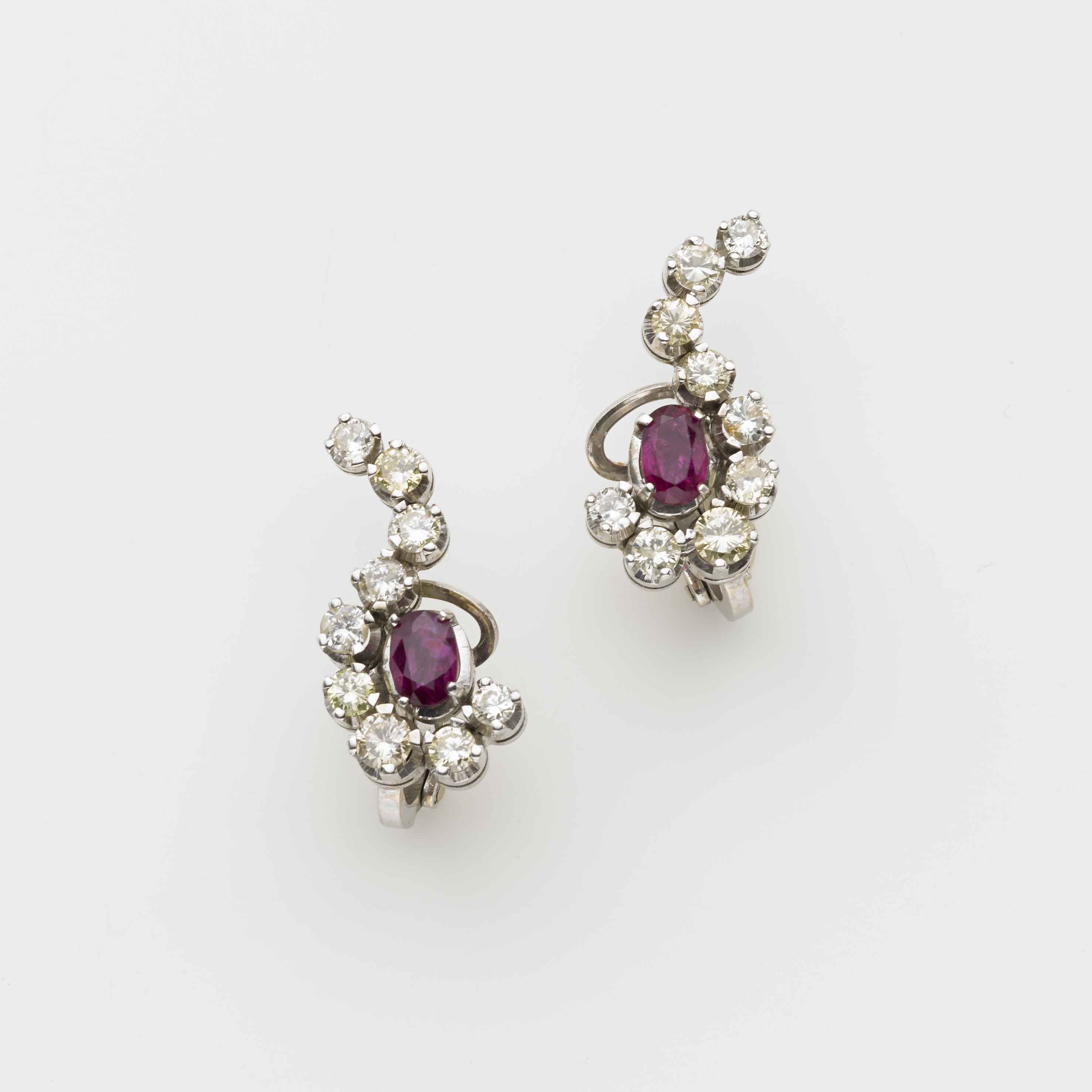 Orecchini a lobo con clips, in oro bianco, diamanti rotondi e due rubini...