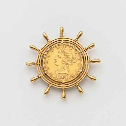 Spilla a guisa di timone con al centro dieci dollari americani del 1894 per...