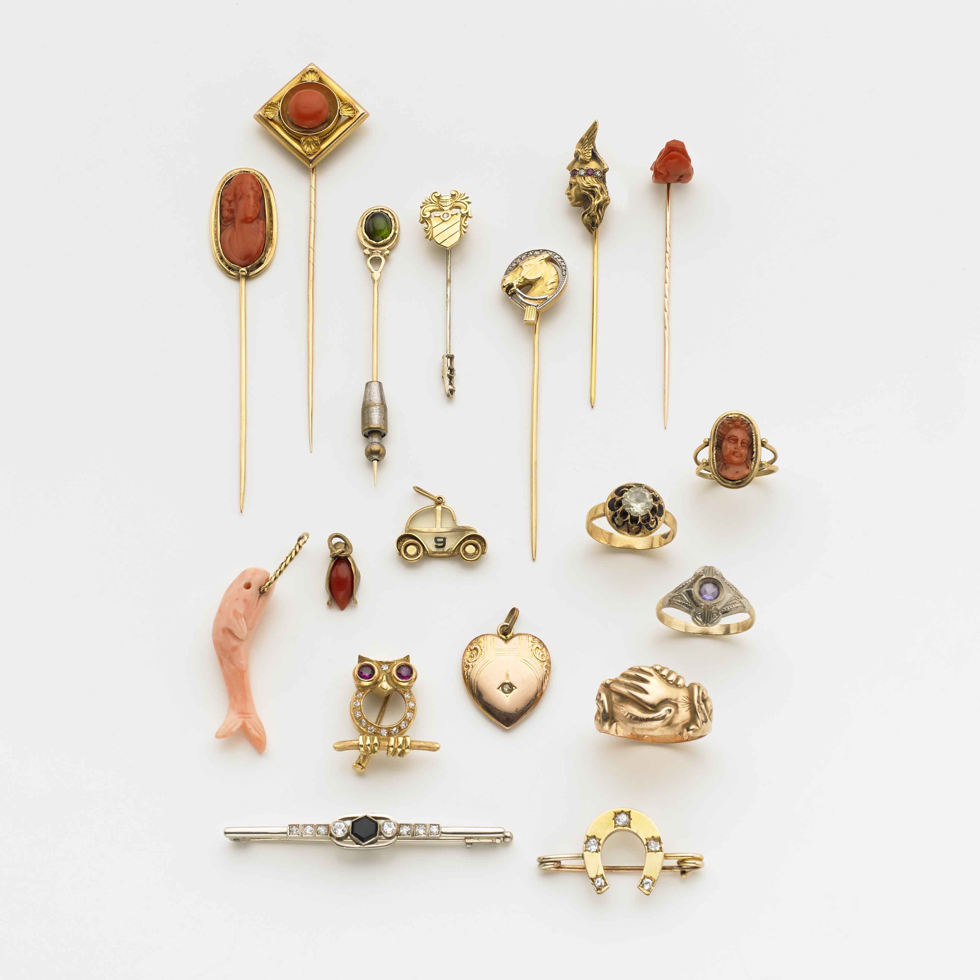 Lotto composto da sette spilloni, due spille, quattro anelli e quattro ciondoli in oro giallo, rosso e bianco, con coralli, diamanti e pietre varie, g.53,70; spilla in oro bianco, diamanti ed onice in oro bianco 585/1000, g.4,20 Lot comprising: seven hatspins, two brooches, four rings and four charms in yellow, red and white gold, with corals, diamonds and gemstones; a white gold with diamonds and onyx brooch