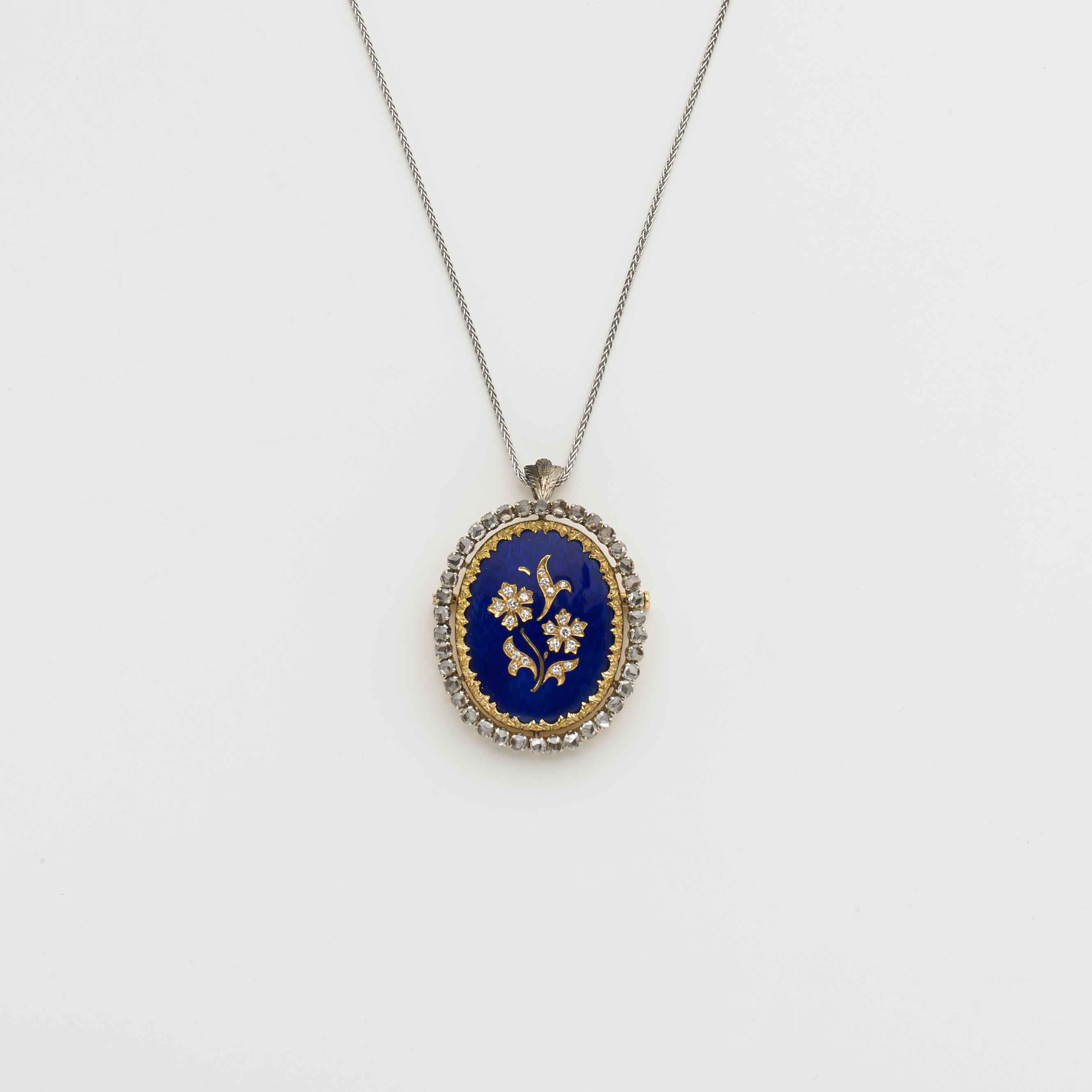 Spilla/ciondolo in oro giallo e bianco con catenina in oro bianco, il ciondolo contornato da diamanti irregolari taglio mezza rosetta e altri huit-huitt a disegnare il fiore con fondo di smalto blu guiloche g. 19 Yellow and white gold brooch/charm with white gold chain, with diamonds