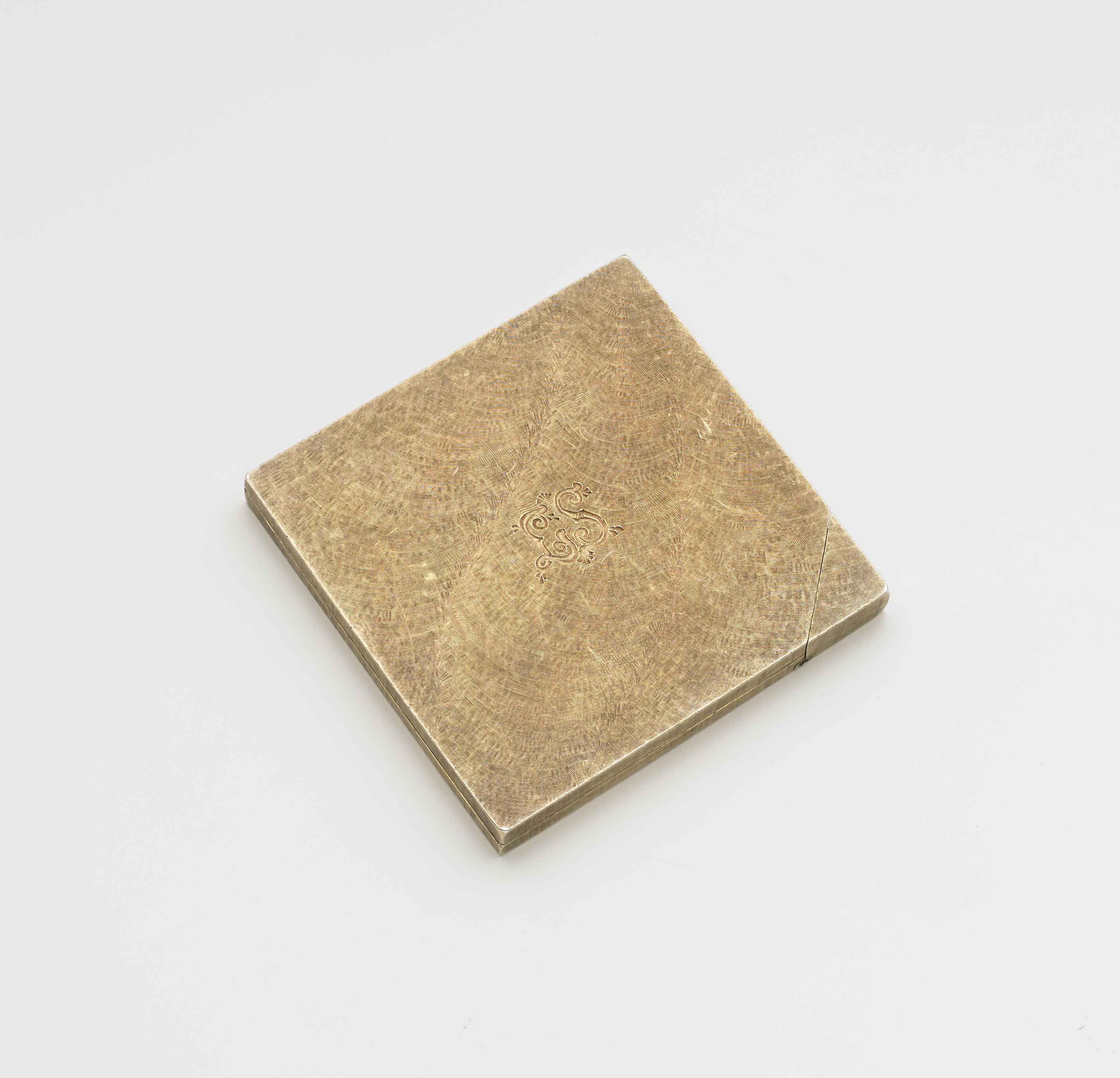 GUCCI Portacipria squadrato con apertura sull'angolo e iniziali incise su argento dorato e satinato di particolare manifattura comprendente lo specchio originale, complessivi g.112 GUCCI Gilt and glazed silver compact with original mirror