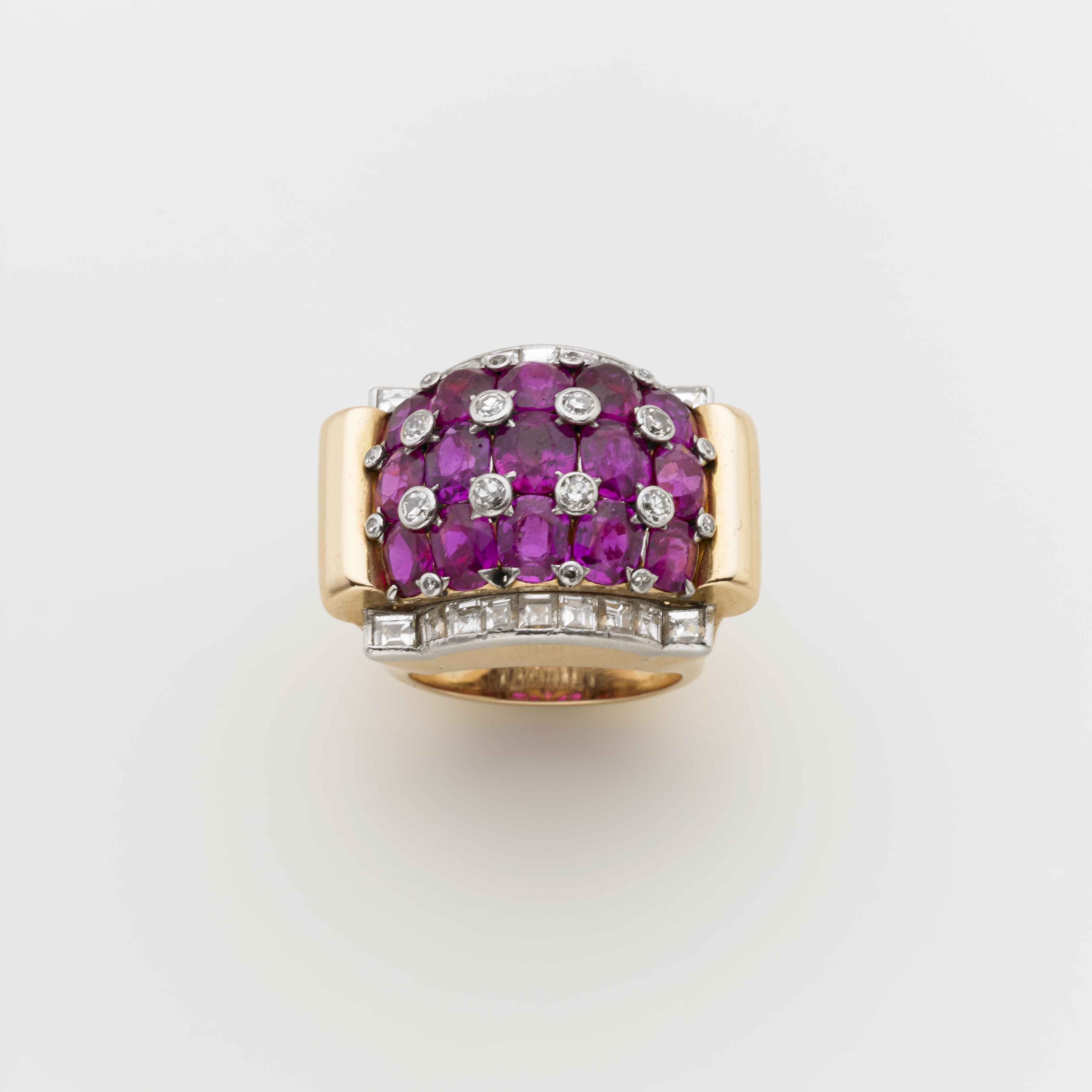 Anello in oro giallo e bianco con diamanti rotondi e carrè a incorniciare rubini ovali taglio composito g. 19,20 misura 11/51 Yellow and white gold bracelet with diamonds surrounding oval rubies