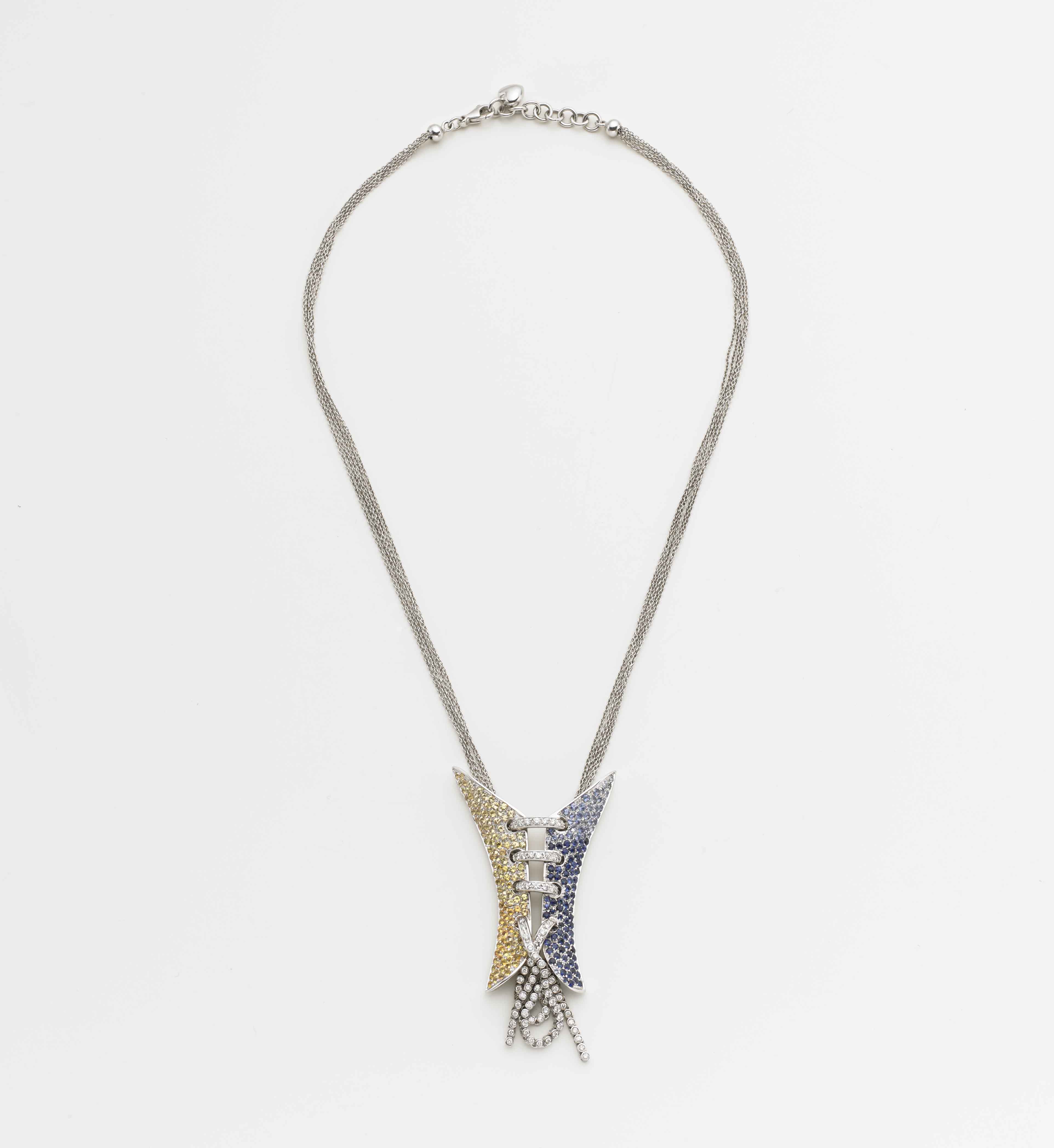 Collier formato da cinque sottili catenine a tenere un ciondolo centrale a forma di boustier tutto in oro bianco con diamanti rotondi e zaffiri blu e gialli g. 29,10 White gold necklace made up of five thin chains with central charm with diamonds and blue and yellow sapphires
