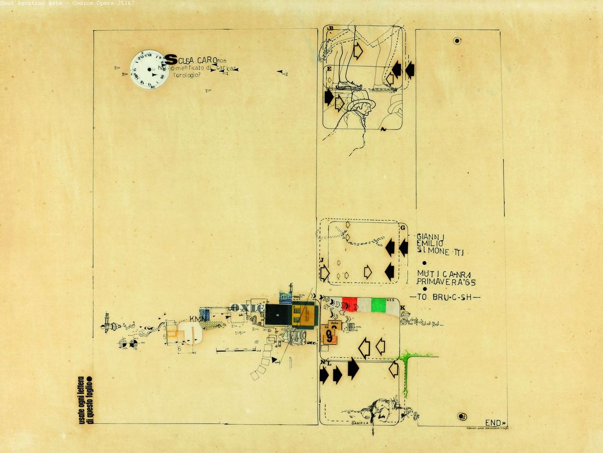 BARUCHELLO GIANFRANCO (Livorno 1924) - "Scusa caro non hai dimenticato di caricare l'orologio?" primavera 1965, 50x68 tecnica mista e collage su carta applicata su masonite