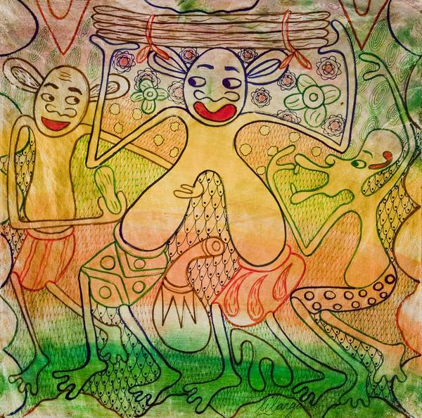 George Lilanga Senza titolo tecnica mista su pelle di capra cm. 30x30 Certificato di autenticità a cura della Galleria Felix Lorenz, Lauenburg (ELBE) Germania Firma in basso al centro