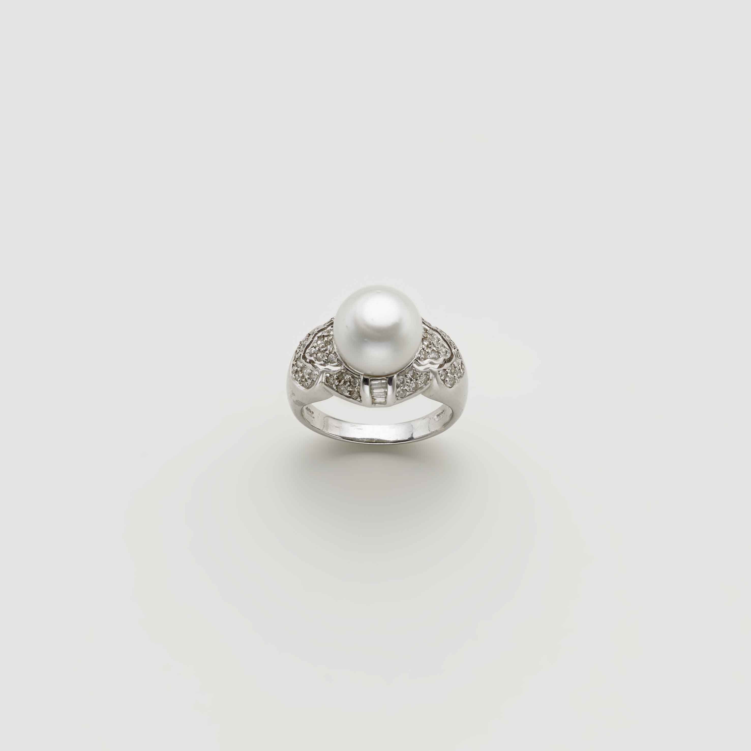 Anello in oro bianco con diamanti rotondi taglio a brillante e baguette a contornare una perla bianca con sfumatura grigia coltivata, g. 7,5 misura 13/53 White gold ring with diamonds and a pearl
