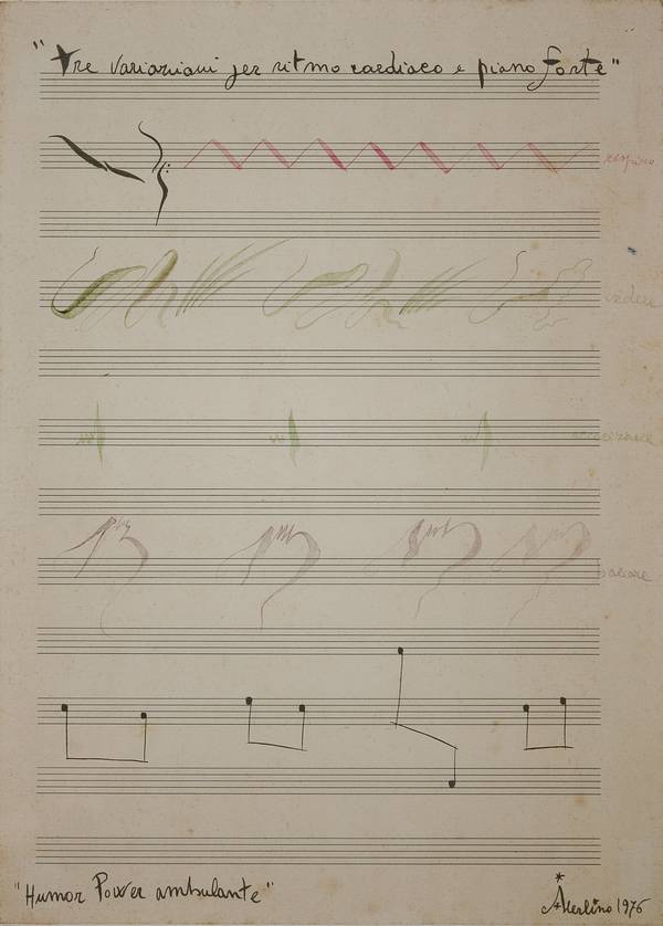 Silvio Merlino Humor Power ambulante:tre variazioni per ritmo cardiaco e pianoforte - 1976 china e acquarello su carta da musica cm. 33x24 Firma in basso a dx