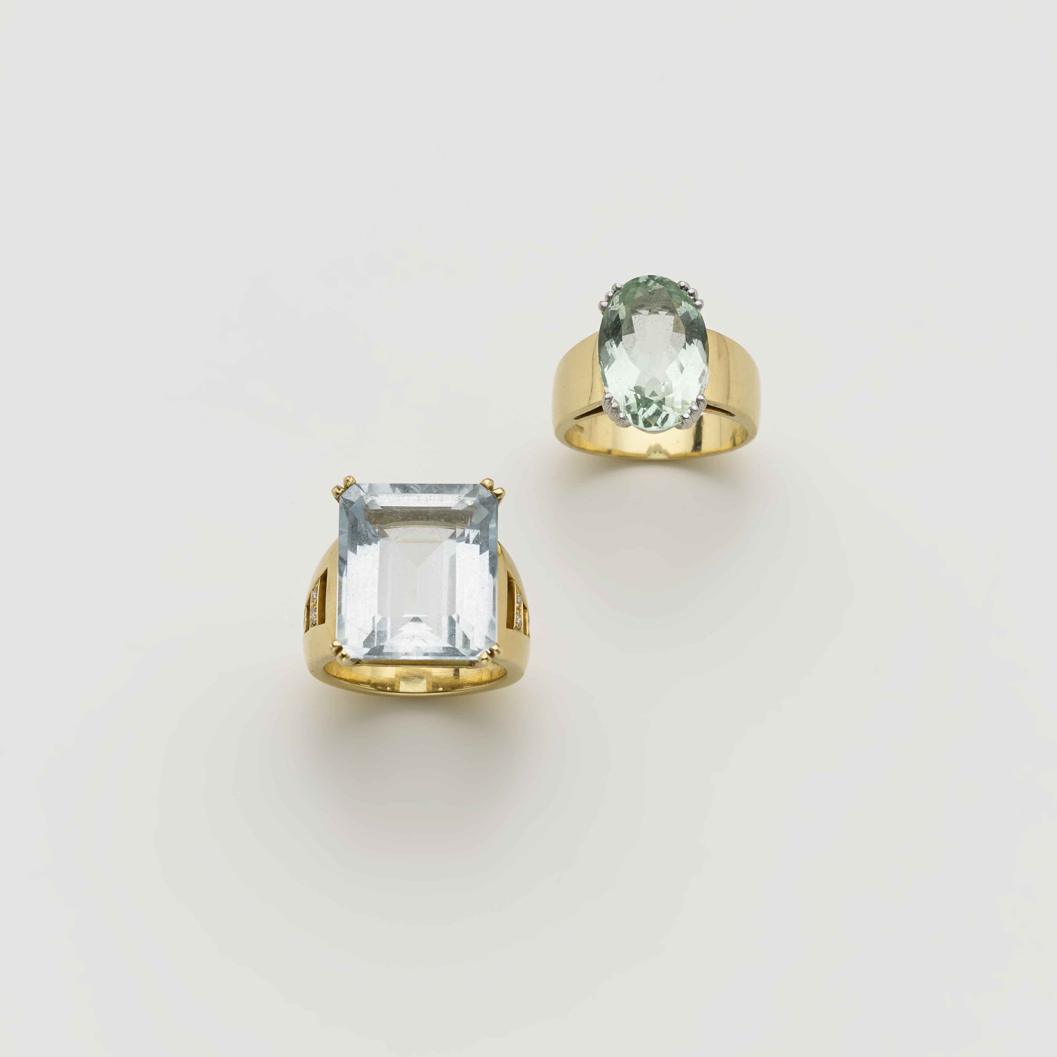 Lotto composto da due anelli in oro giallo e bianco uno con diamanti e un'acquamarina ottagonale taglio a gradini e l'atro con un'acquamarina ovale taglio composito verdastra g. 30,10 misure 14/54 e 16/56 Lot comprising two yellow and white gold rings, one with diamonds and aquamarine, the other with aquamarine
