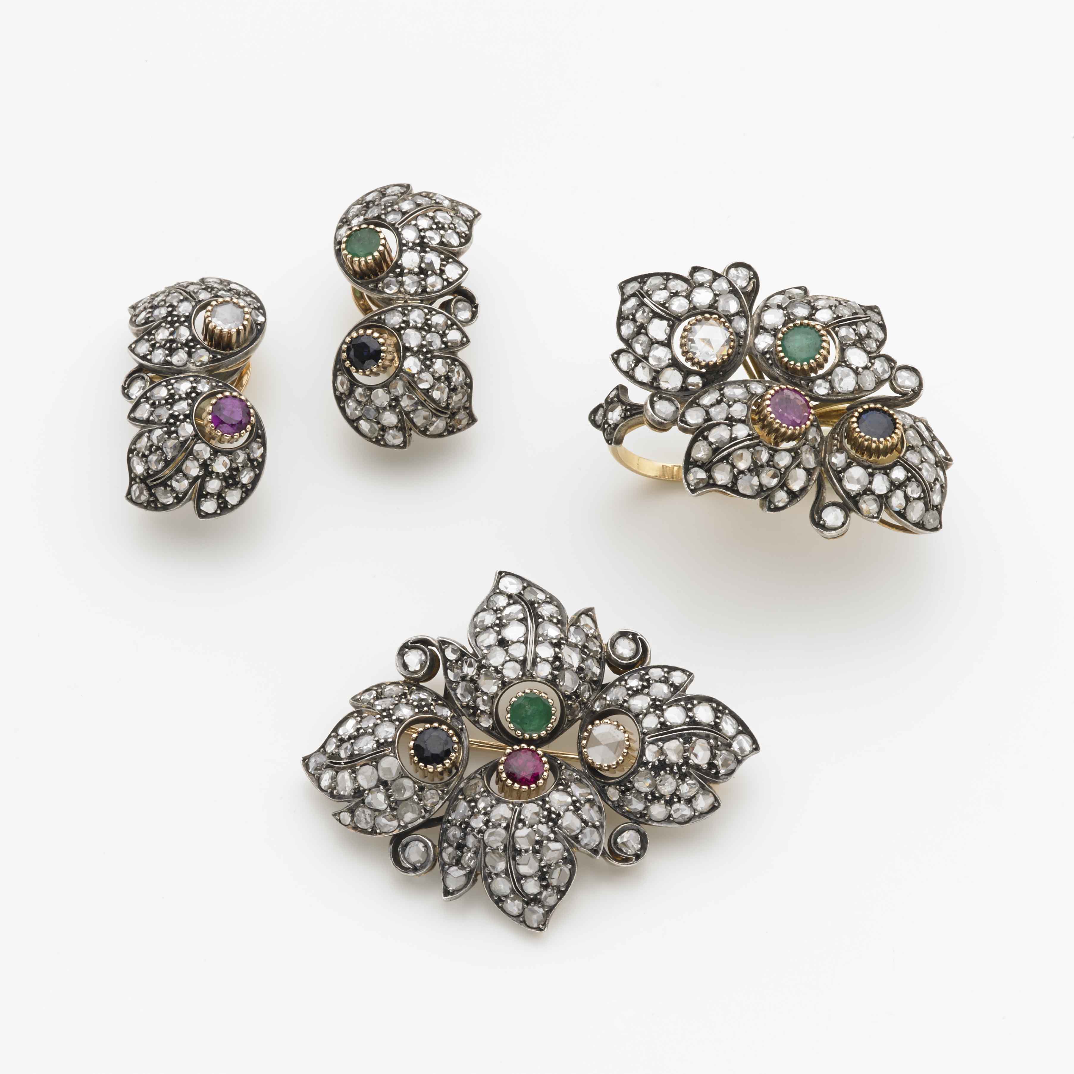 Parure formata da spilla, orecchini ed anello a doppio dito in oro giallo ed argento con diamanti taglio mezza rosetta, rubini, zaffiri e smeraldi, complessivi g.51,50 Gold and silver, diamond, sapphire, emerald and ruby parure comprising a brooch, earings and a ring