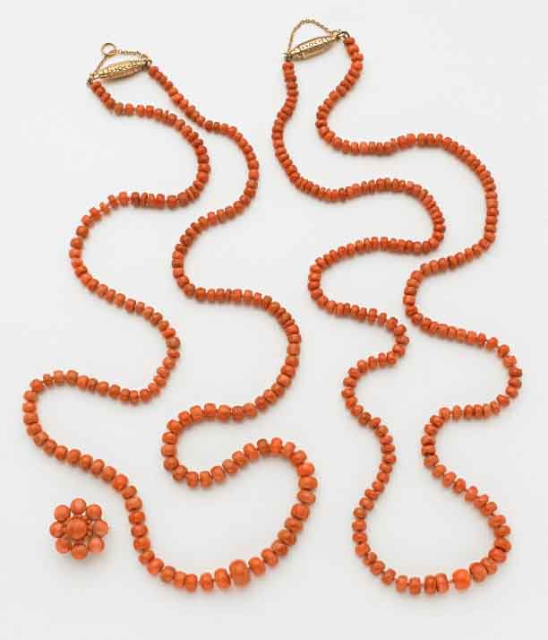 Lotto composto da due collane scalate di corallo arancione a barilotto da 6 a 9/12mm lunghe rispettivamente 90cm e 94cm circa con chiusura in oro giallo a barilotto e spilla a fiore in cabochon di corallo arancione e rifinita in metallo, complessivi g.130,30 Lot comprising two graduated orange coral necklaces and an orange coral brooch with metal trimmings
