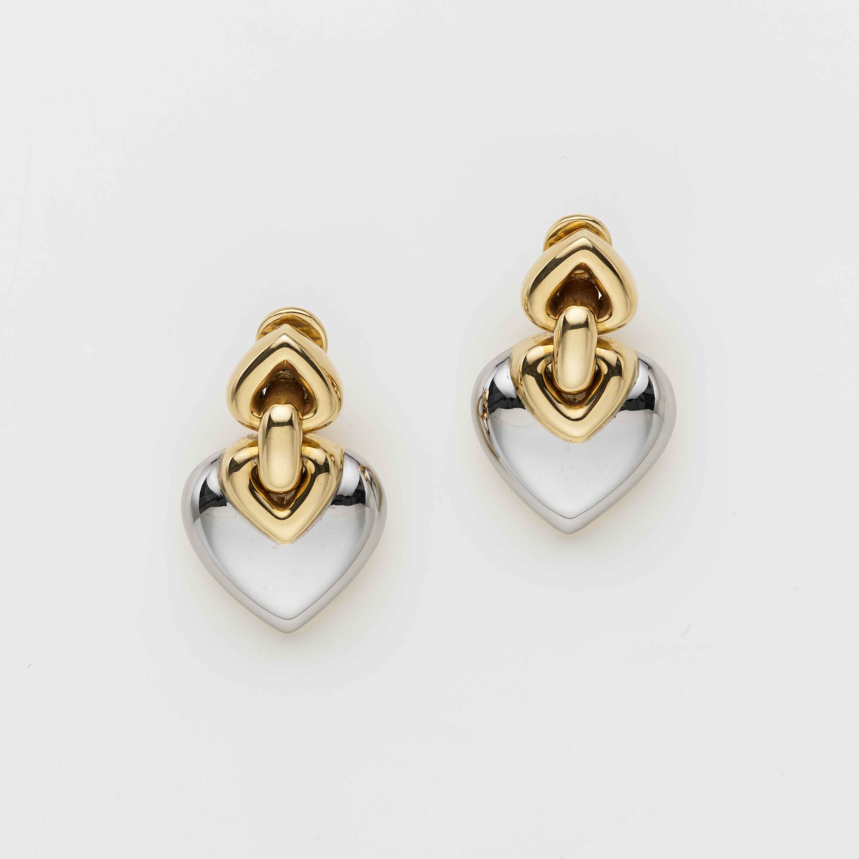 BULGARI Orecchini in acciaio e oro a guisa di cuore, complessivi g.28,20, Steel and gold heart earings. Bulgari