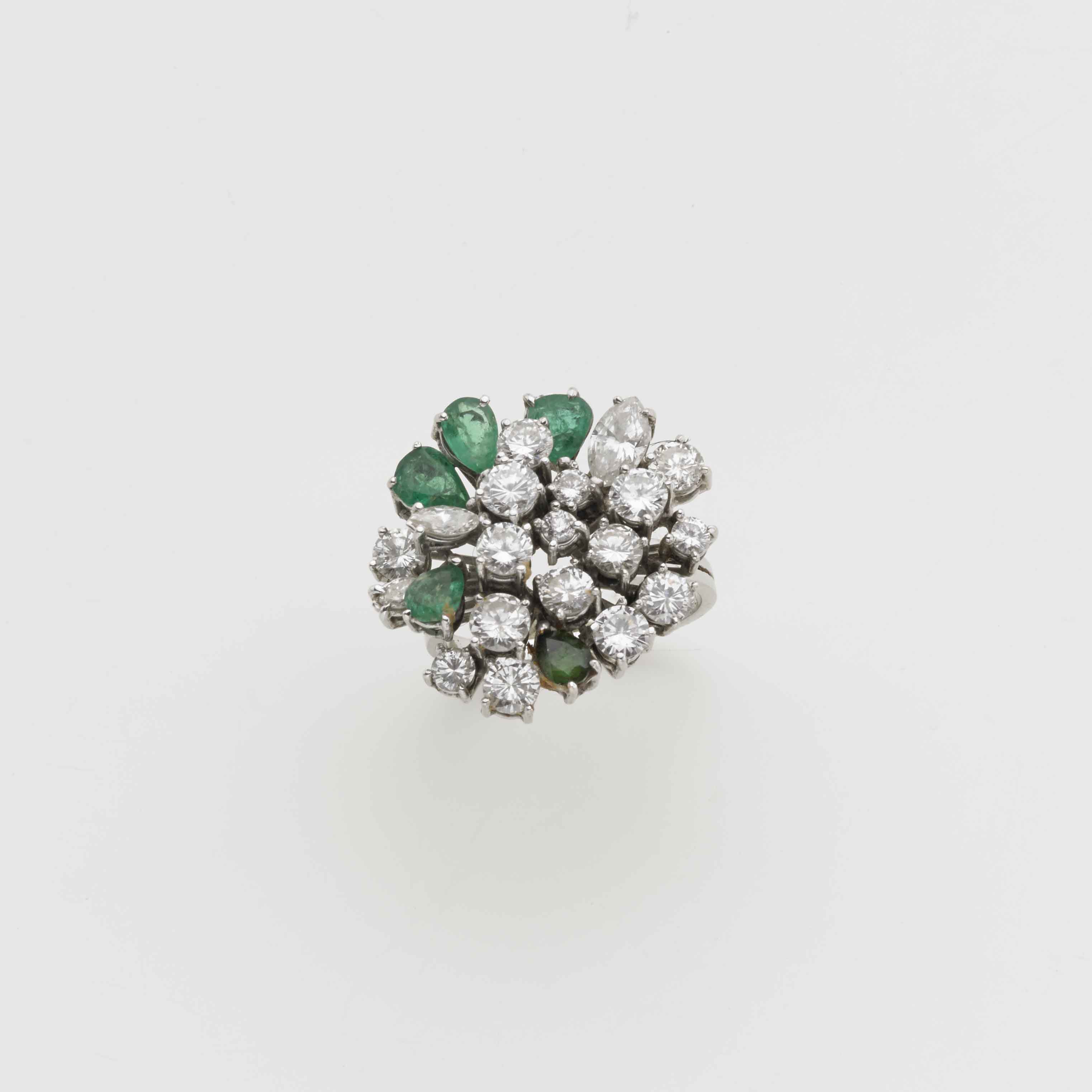 Lot 397 | Anello in oro bianco con diamanti rotondi e a marquise, smeraldi a goccia,...