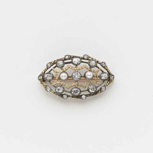 Spilla in oro giallo, rosso e argento con nove diamanti di forma ovale, cuscino e rotonda per complessivi ct. 2,50 circa e altri dieci diamanti rotondi tutti taglio antico per ct.0,50 circa, al centro due piccole perle bianche coltivate di 4,50mm, g.13,90 Diamond and pearl silver and bi-coloured gold brooch