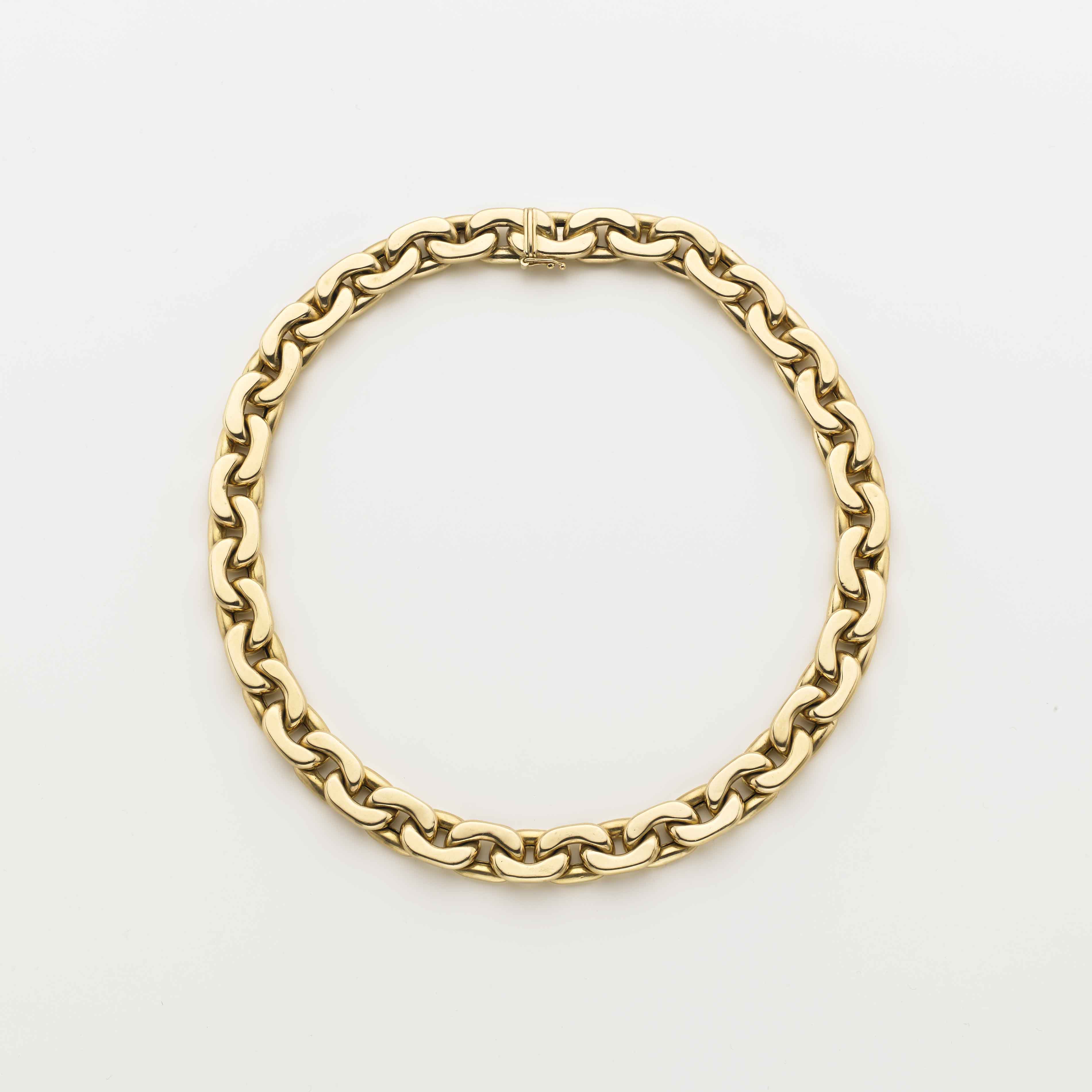 Collier in oro giallo a maglia gurmette allungata piatta g. 82,40, lungh. cm 42 (lievi difetti) Prodotto da Weingreill Carlo su disegno di Schreiber e dallo stesso venduto con garanzia rilasciata a Milano settembre 2015 Gold necklace (minor defects) Crafted by Weingreill Carlo on a Schreiber design, with guarantee issued in September 2015 in Milan