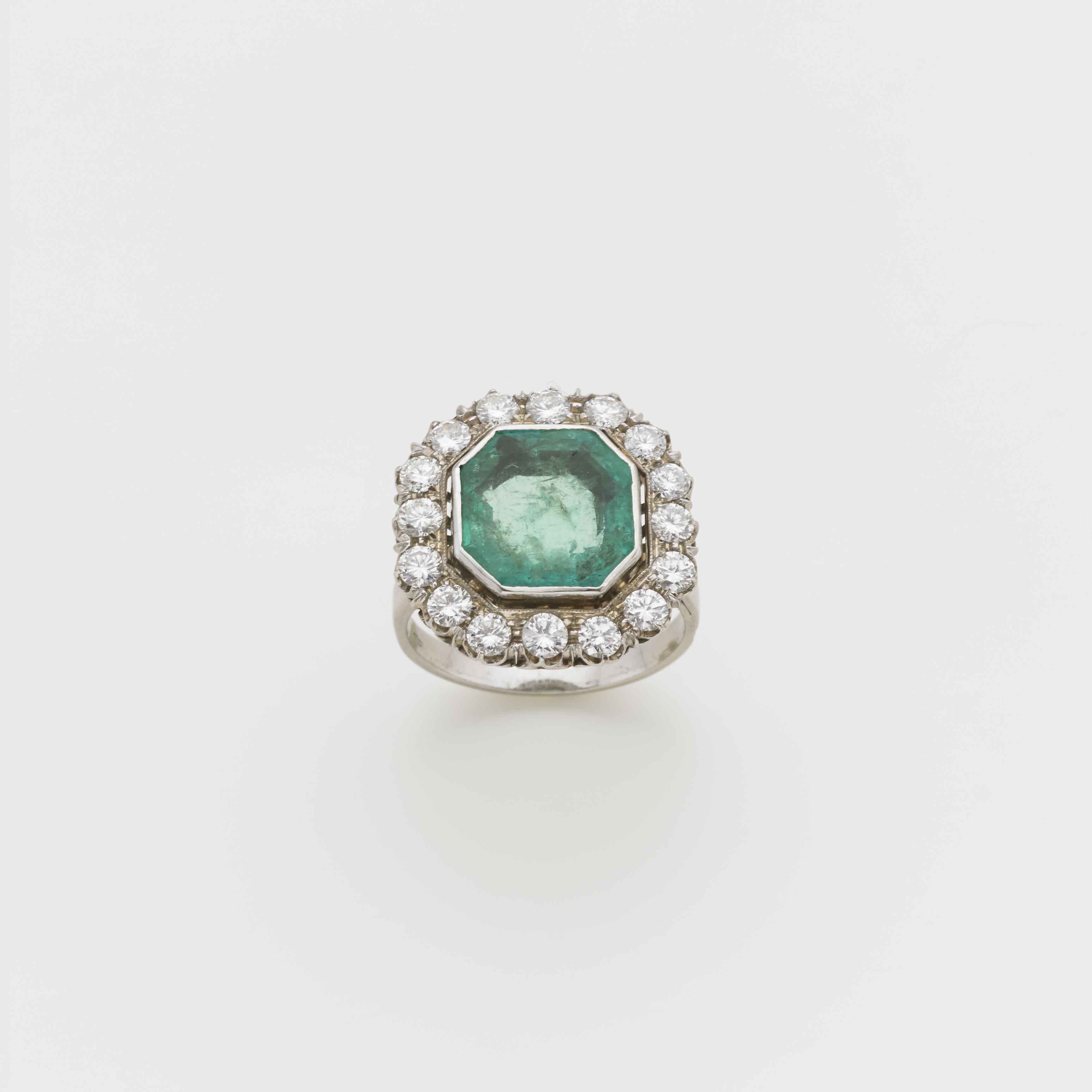 Anello in oro bianco con diamanti rotondi taglio a brillante a contornare uno smeraldo ottagonale taglio composito di ct 4,40 circa g. 6,70 misura 15/55 White gold ring with diamonds and emerald