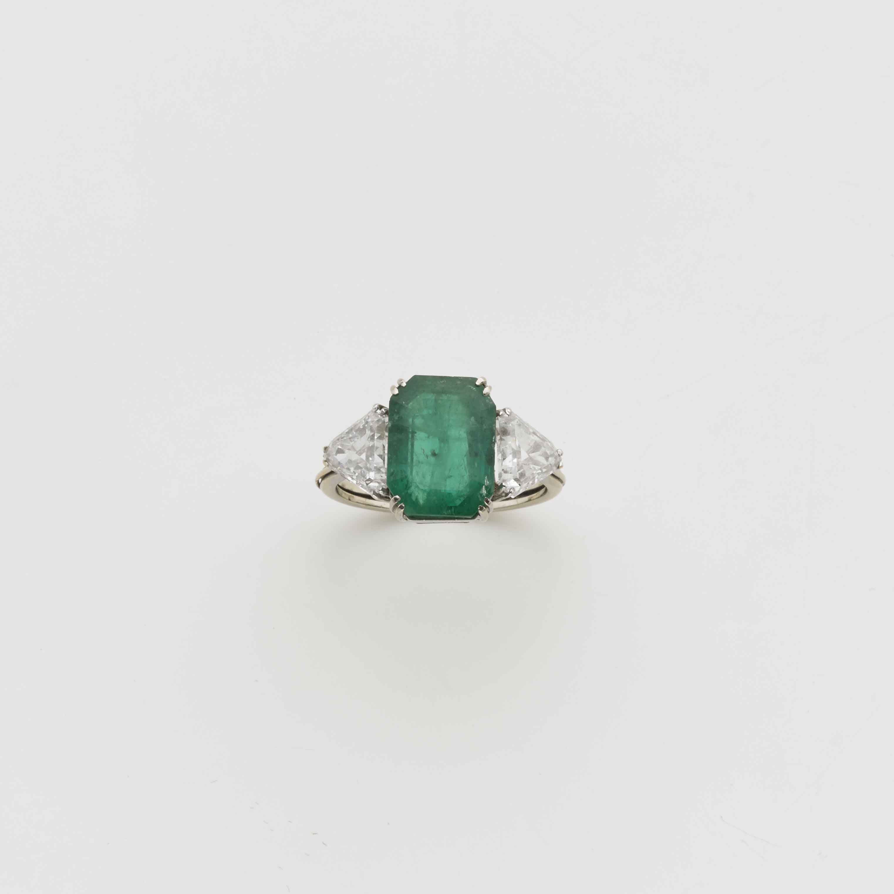 Anello oro bianco, con smeraldo ottagonale ct. 3,75 circa, e due diamanti triangolari. g. 3,90, misura 14/54 White gold ring with octagonal emerald and two triangular diamonds