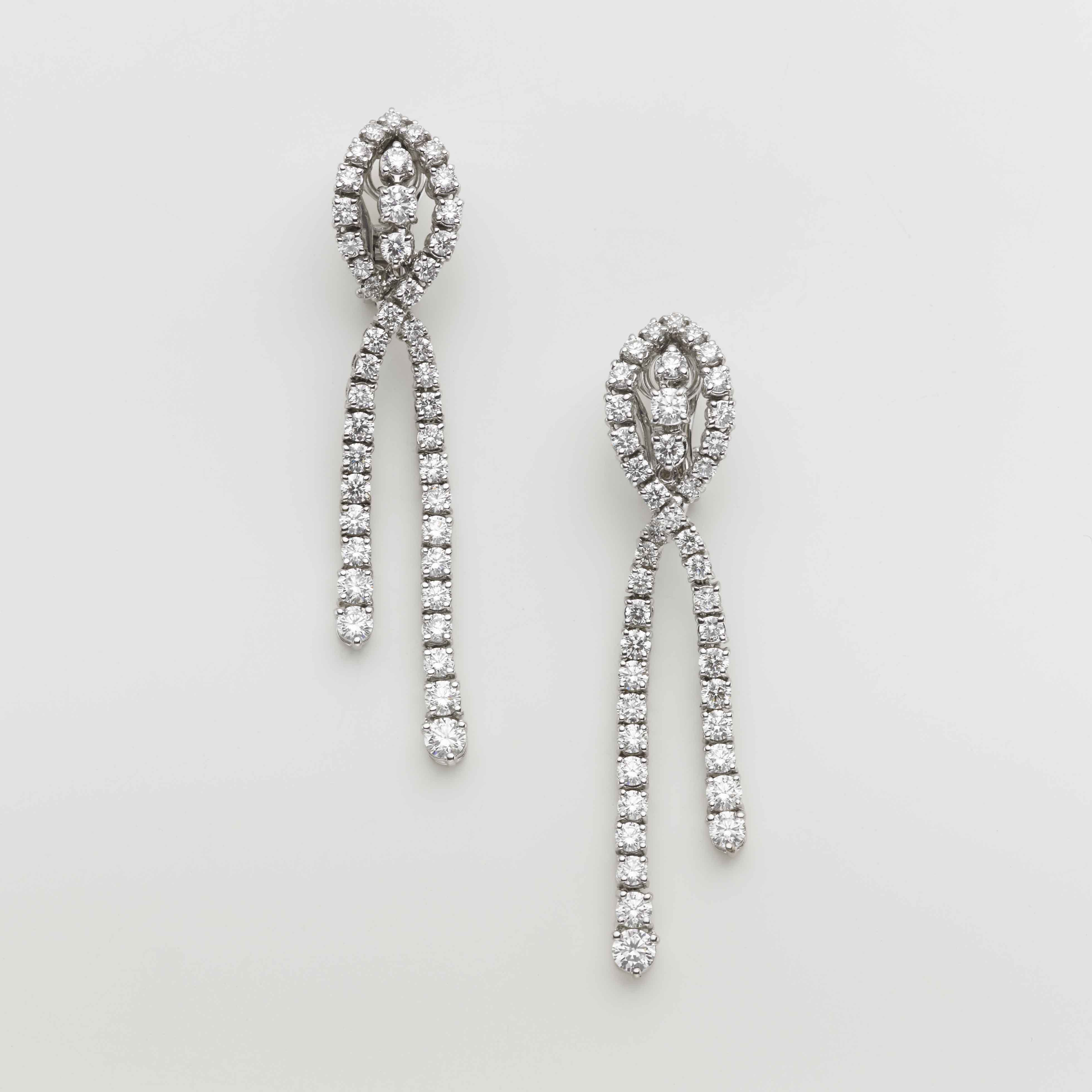 Orecchini pendenti in oro bianco con diamanti rotondi taglio a brillante intrecciati con due code g. 15,70 White gold drop earrings with diamonds