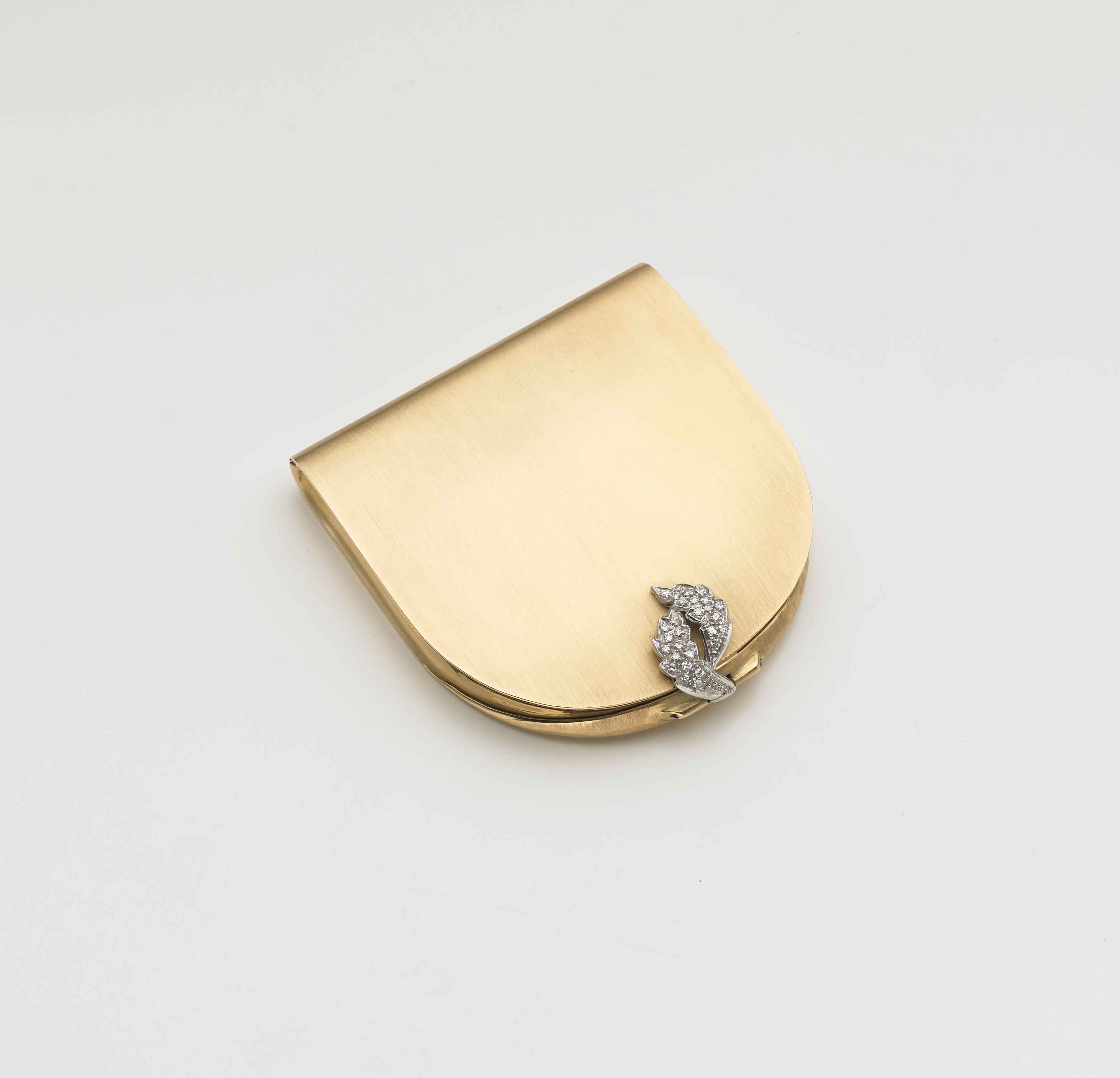 Portacipria in oro giallo lucido e satinato con chiusura a doppia foglia in oro bianco con diamanti rotondi taglio huit-huit, complessivi g. con specchio e retina 128,40 Polished and glazed gold compact with diamonds