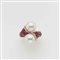 Anello in oro giallo lievemente elastico a contrariè, diamanti rotondi taglio a brillante ct 0,70 circa e rubini ovali ct 8,20 circa e due perle coltivate bianche mm 13 circa g. 15,60 misura 18/58 Crossover rring with diamonds, rubies, and cultured pearls