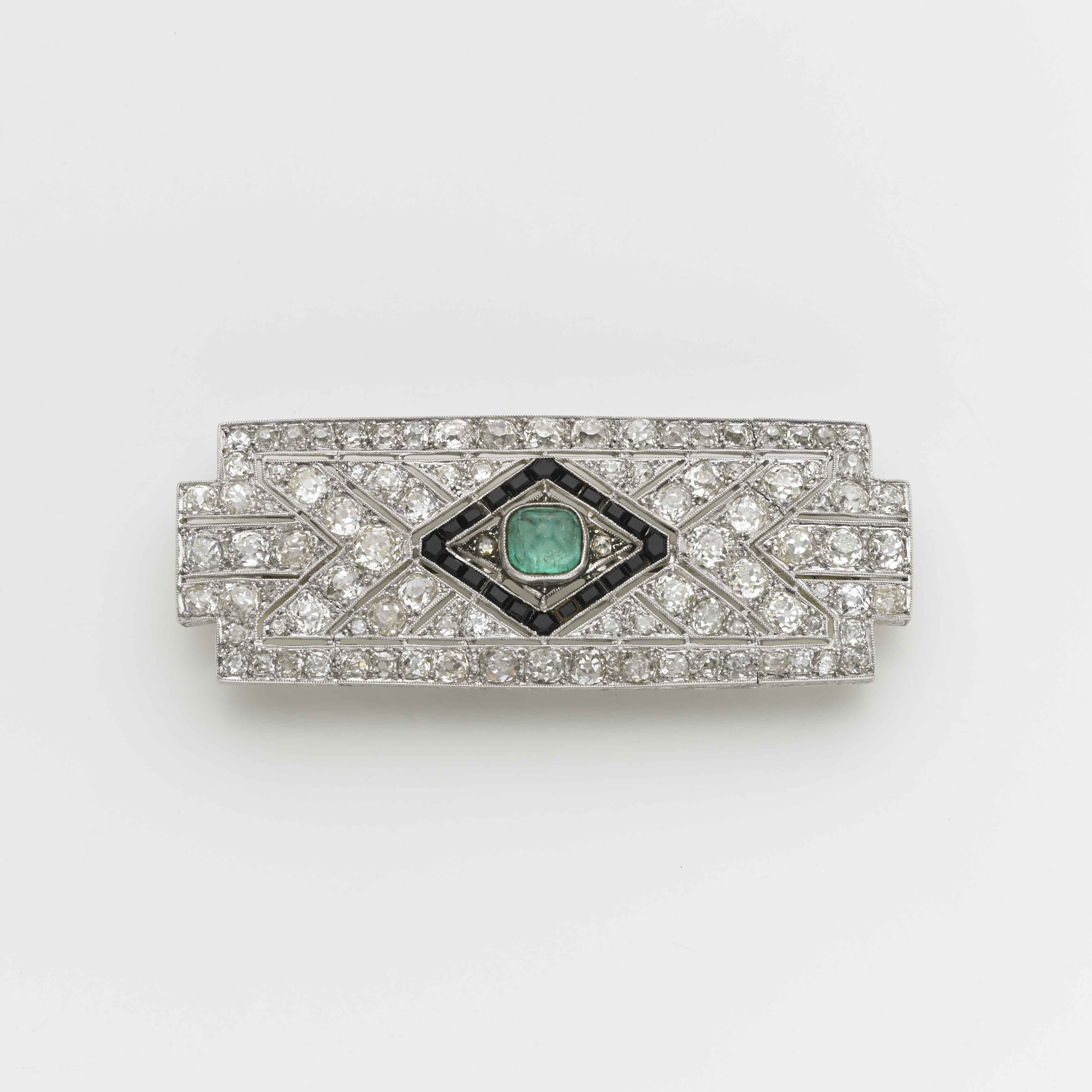ROBIN, MAURICE & (CIE) 1903-1923 Spilla in platino con diamanti rotondi taglio a brillante vecchio europeo ed onice a contornare uno smeraldo di forma a cuscino taglio cabochon piramidato g. 26,30 lungh. cm 6,50 ROBIN, MAURICE & (CIE) 1903-1923 Platinum brooch with diamonds and onyx surrounding an emerald