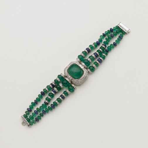 VESCHETTI Bracciale in oro bianco con al centro uno smeraldo forma cuscino taglio cabochon contornato da pavè di diamanti rotondi taglio a brillante e carrè sul lato, dal centro si diramano tre fili per parte di smeraldi e zaffiri a boules schiacciate distanziate da rondelle in oro bianco con diamanti, lungh. cm 19,50 g. 85 VESCHETTI White gold bracelet with emeralds, diamonds, and sapphires