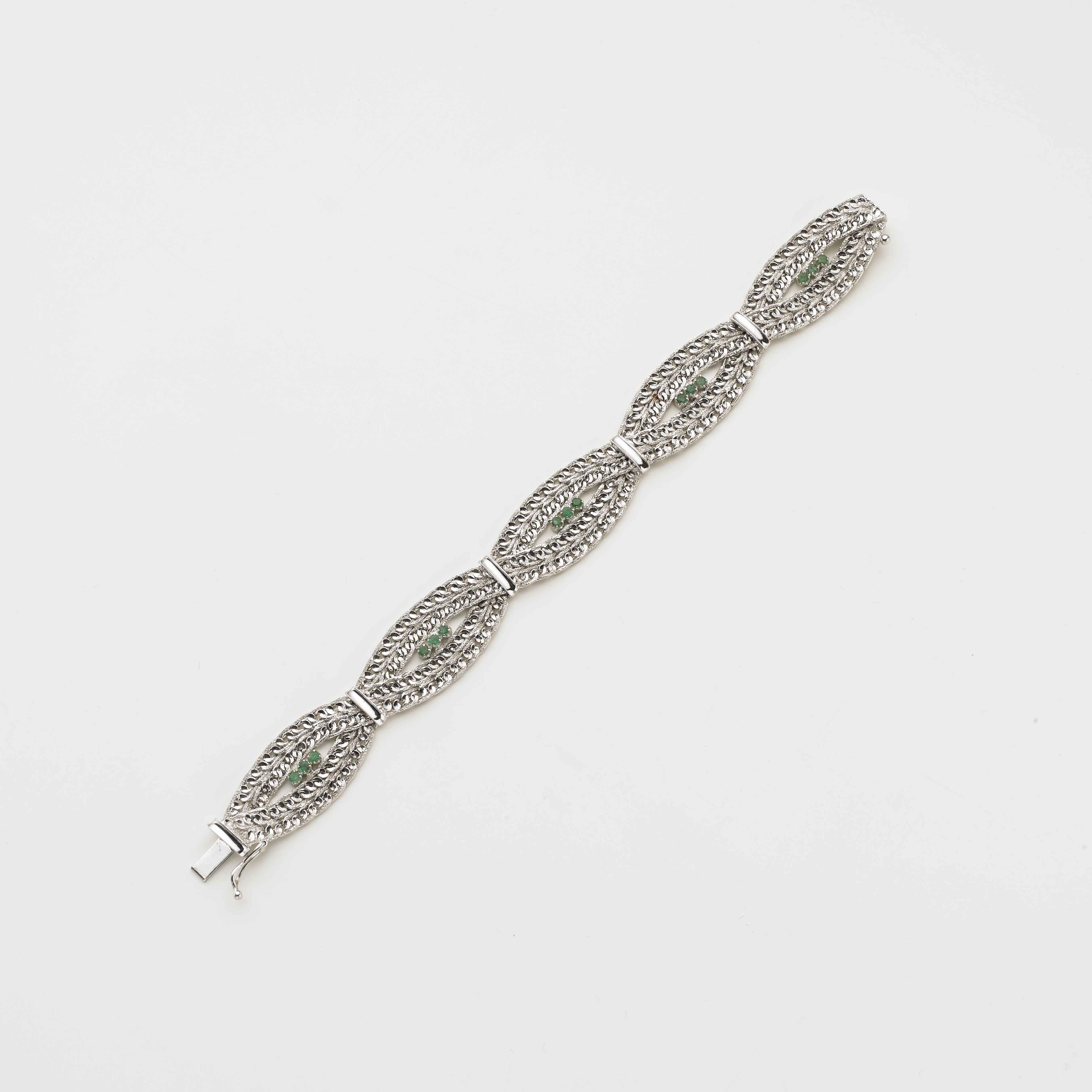 Bracciale in oro bianco intrecciato lucido e zigrinato con smeraldi rotondi...