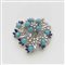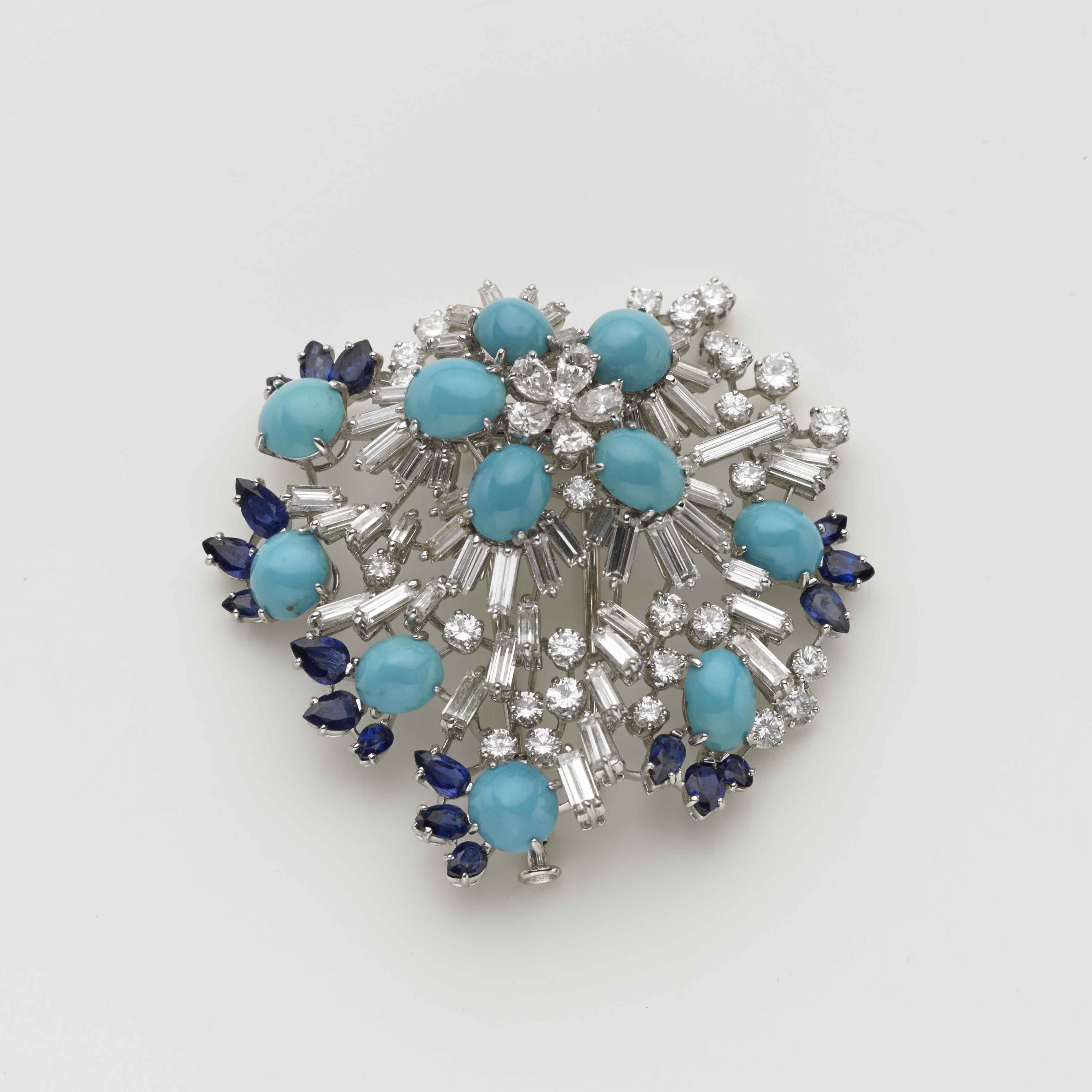 Spilla in oro bianco con diamanti rotondi e rettangolari, turchesi ovali, taglio cabochon e zaffiri a goccia, g.26,70. Scatola Fesano Torino White gold brooch with diamonds, oval turquoises, and drop sapphires