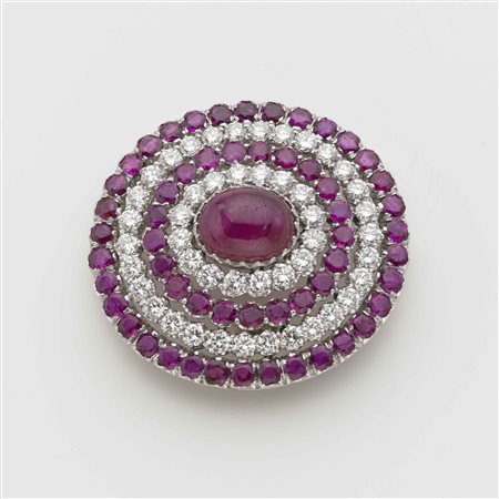 CHANTECLER CAPRI Spilla ovale in platino con quattro giri concentrici alternati di rubini rotondi taglio composito e diamanti taglio a brillante a contornare un rubino ovale cabochon mm 14x11 circa CHANTECLER CAPRI Platinum brooch with rubies, diamonds, and sapphire.