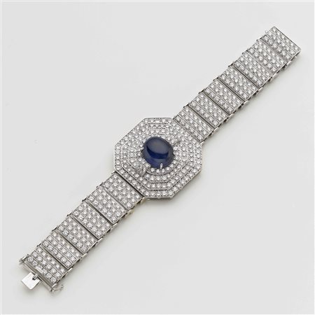DAVID WEBB- STEPHAN HAFNER Particolarissimo bracciale formato da un centrale (nato spilla) di David Webb in oro bianco con diamanti rotondi taglio a brillante a contornare come a gradini uno zaffiro ovale cabochon alla quale è stato aggiunto il bracciale in oro bianco diamanti rotondi taglio a brillante da Stephan Hafner complessivi g. 114, lungh. cm 18 DAVID WEBB- STEPHAN HAFNER White gold bracelet with central element (designed as a brooch) with diamonds and sapphire