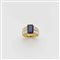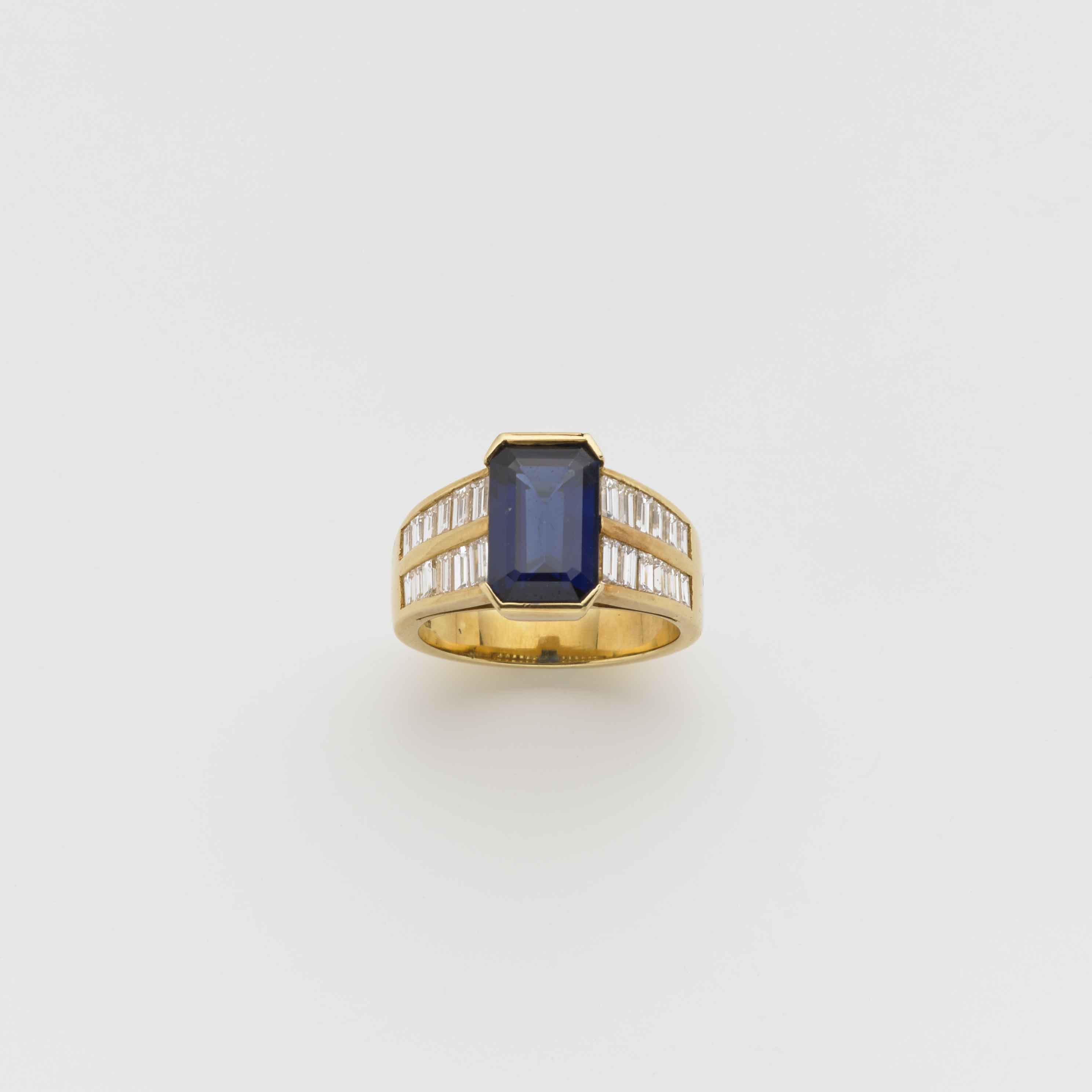 Anello in oro giallo con al centro zaffiro ottagonale ct 3,85 circa e diamanti a baguette sul gambo g. 9,20 misura 14/54 Gold ring with central sapphire and diamonds