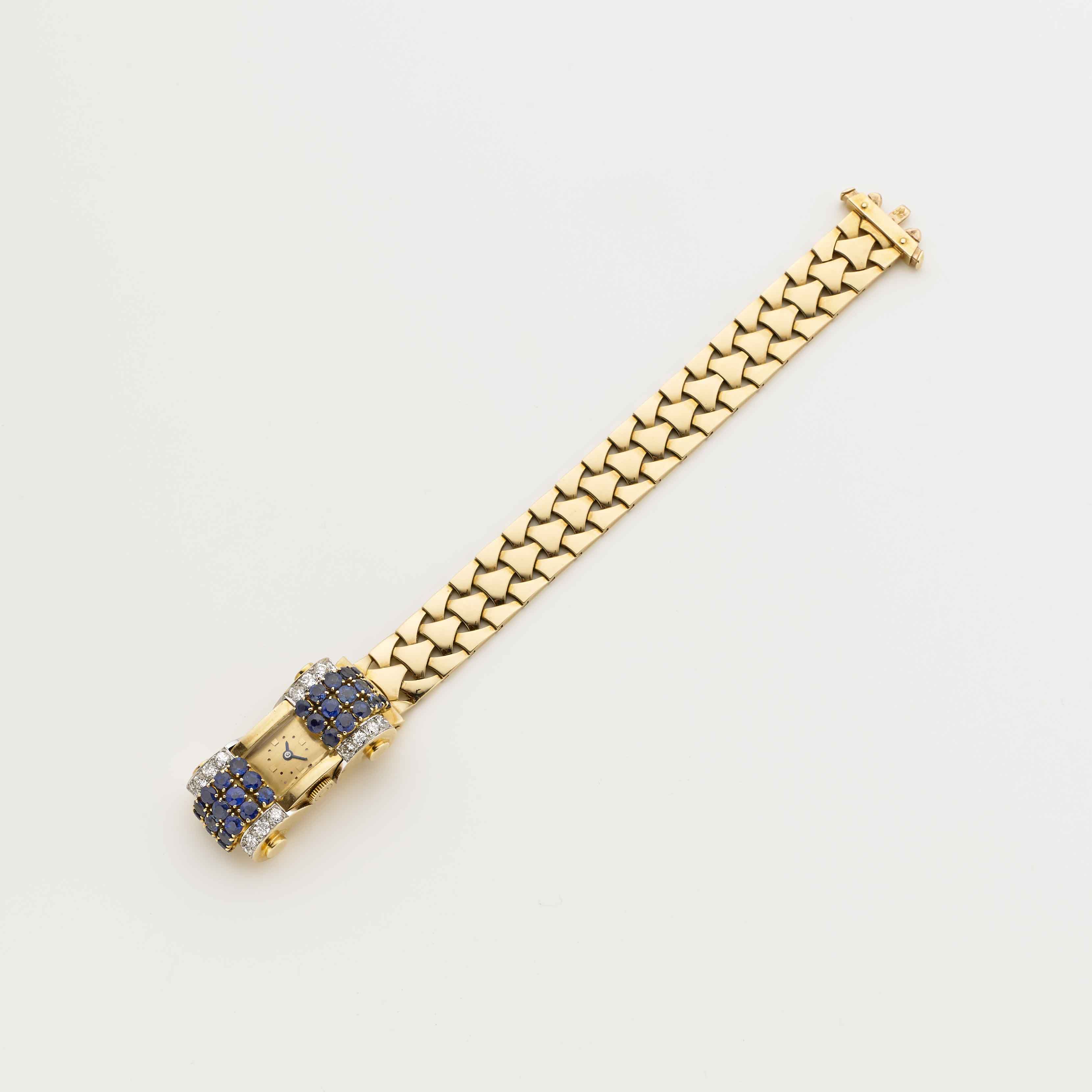 Raro orologio gioiello da donna in oro giallo e bianco, 1930 circa con incastonati diamanti rotondi taglio a brillante vecchio europeo e degli zaffiri rotondi taglio composito ad incorniciare l'orologio. Punzoni vari, firmato Van Cleef et Arpels n. 54365. gr 62,50 Van Cleef & Arpels Rare lady'e bi-coloured gold diamond and sapphire wrist watch, circa 1930. Various marks signed Van Cleef et Arpels