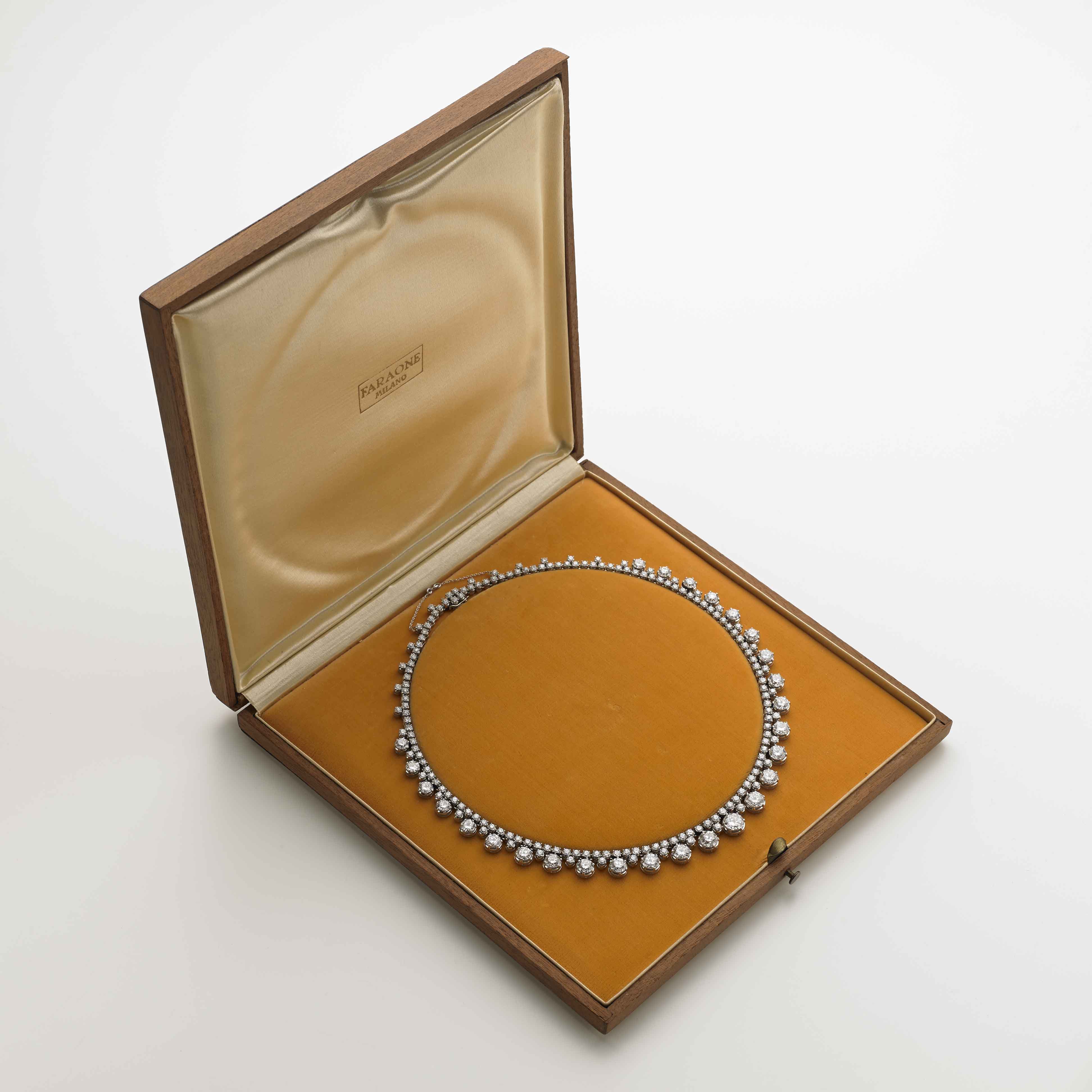 FARAONE VIA MONTENAPOLEONE MILANO Collier in platino con diamanti rotondi taglio a brillante per complessivi ct 29,77 di cui il centrale di ct 1,35 Astuccio originale, corredato da ricevuta di vendita originale del 19/09/1950 FARAONE VIA MONTENAPOLEONE MILANO Platinum necklace with diamonds. Original case and original sales receipt of 19/09/1950
