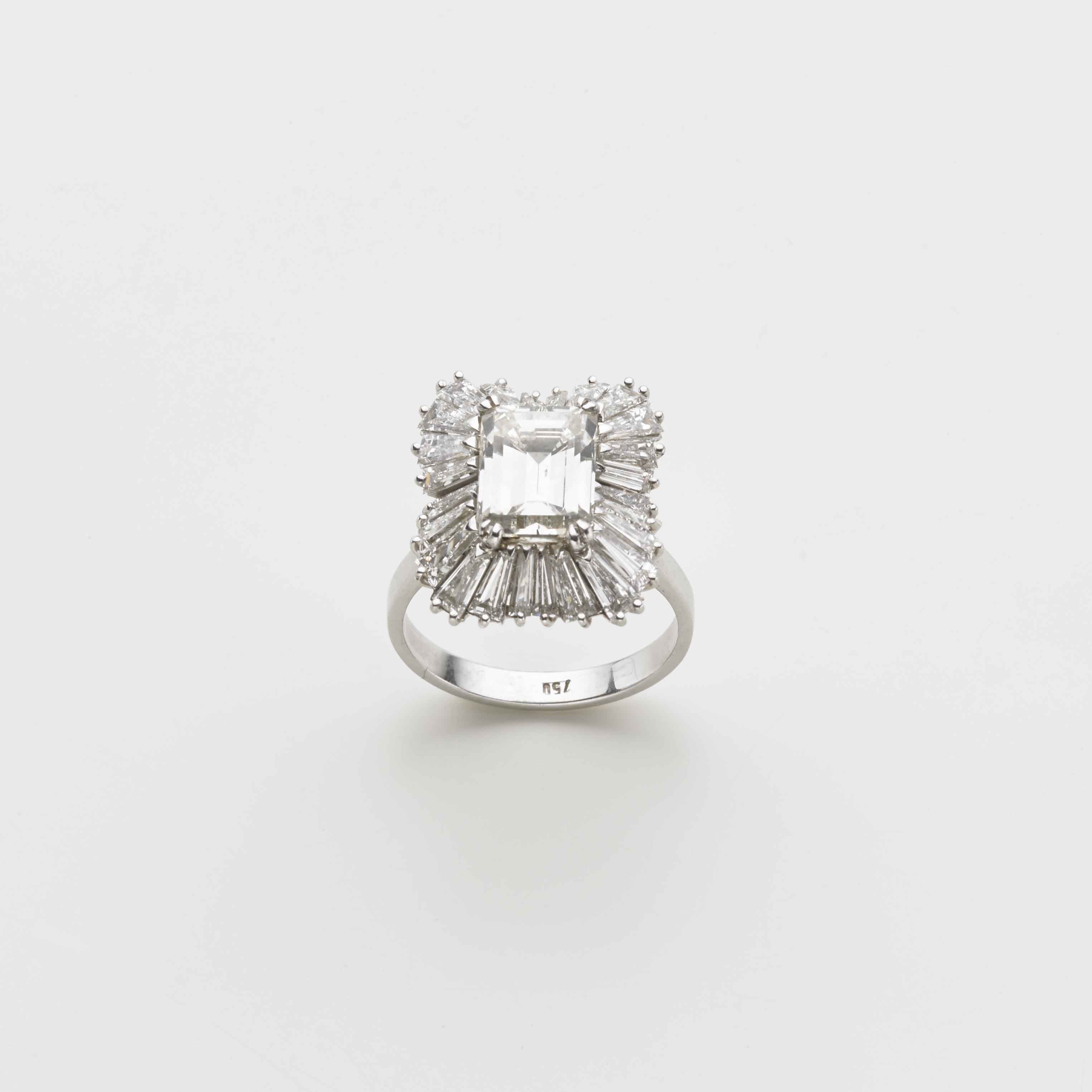Anello in oro bianco con diamanti tapered a contornare un diamante rettangolare ad angoli tronchi taglio a gradini di ct 3,19 g. 6,60 misura 16/56 Accompagnato da analisi gemmologica CISGMe n. 1857IAA Milano 14/10/2015 White gold ring with diamonds. Appended CISGEM gemmological report