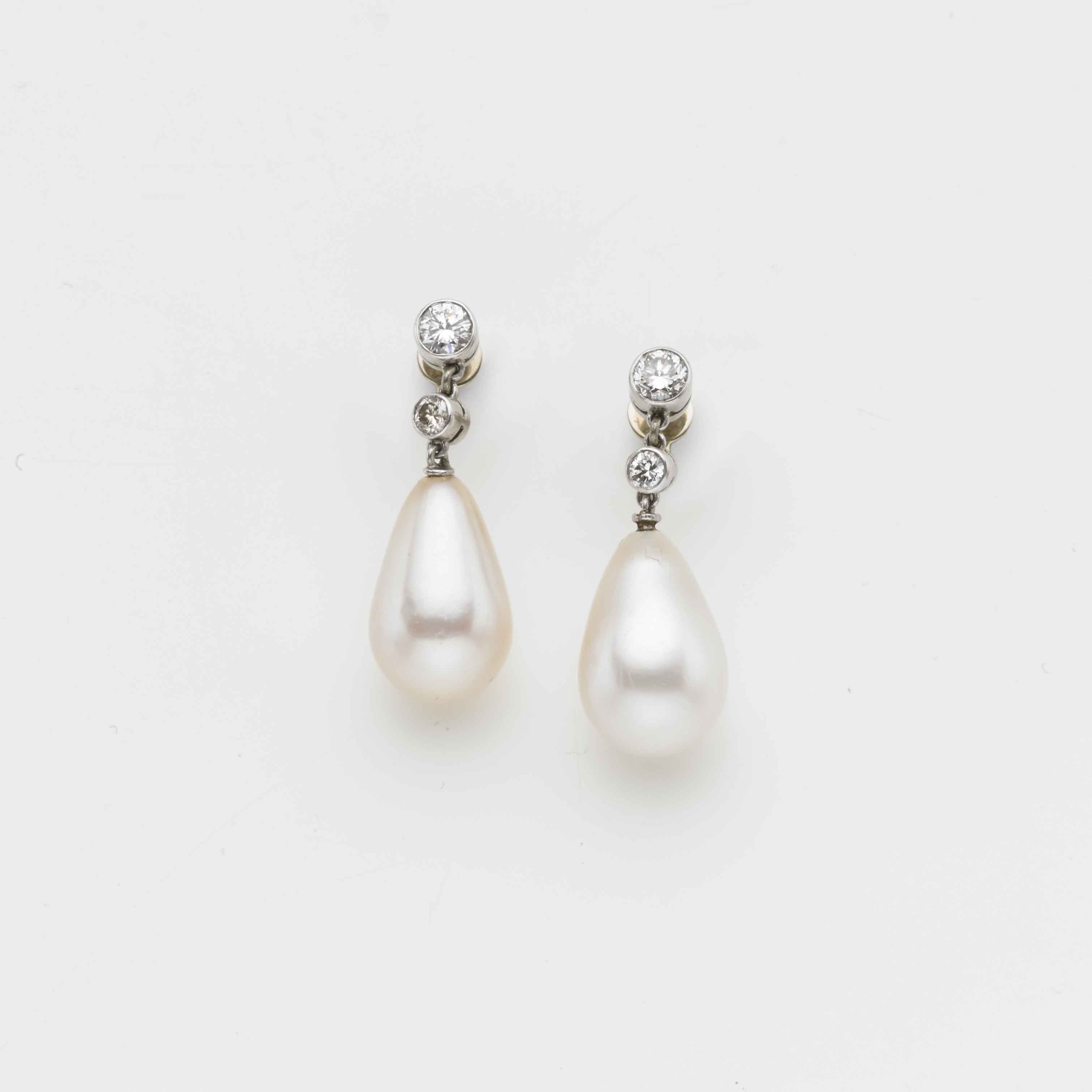 Orecchini pendenti in oro bianco con due diamanti rotondi taglio a brillante a sostenere due perle naturali di acqua salata a goccia di colore bianco con sfumatura crema della dimensione 10,06x10,11 mm h 16,50 mm e l'altra 10,42x10,83 mm h 16,15 mm complessivi g. 6,90 Accompagnate da certificato gemmologico CISGEM n. 80566 Milano 4 settembre 2013 White gold drop earrings with diamonds and natural pearls. Appended CISGEM gemmological report