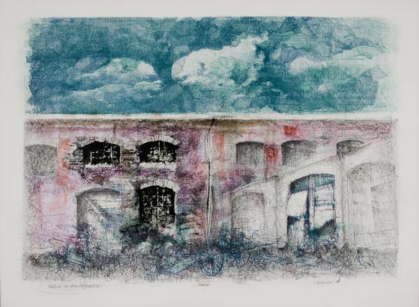 Renzo Vespignani Vecchia fabbrica - 1996 pastelli su base litografica su carta su tela, esemplare unico cm. 60x80 Firma in basso a dx In basso a dx timbro a secco della Stamperia L’Acquaforte, Roma