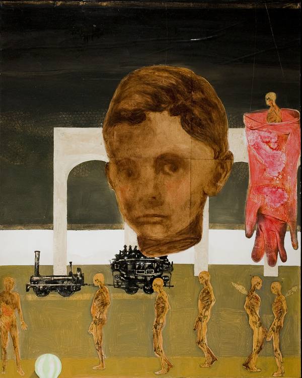 Massimo Gurnari Infanzia sospesa con guanto di gomma rosso - 2005 tecnica mista e collage su tela cm. 120x95 Firma sul retro