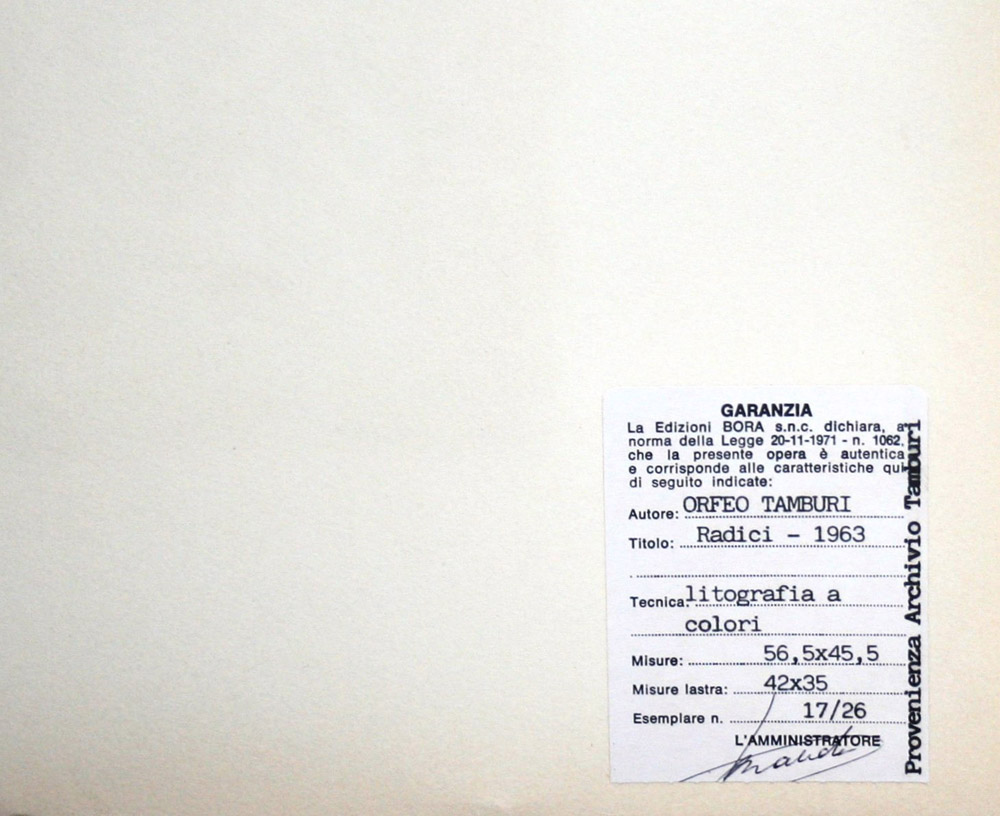 Orfeo Tamburi 1910, Jesi (An) - 1994, Parigi (Francia) - [Italia] Radici litografia a colori 46x57 1963 n.17/26; firma in basso a destra e numerazione in basso a sinistra certificato di garanzia Edizioni Bora; provenienza Archivio Tamburi