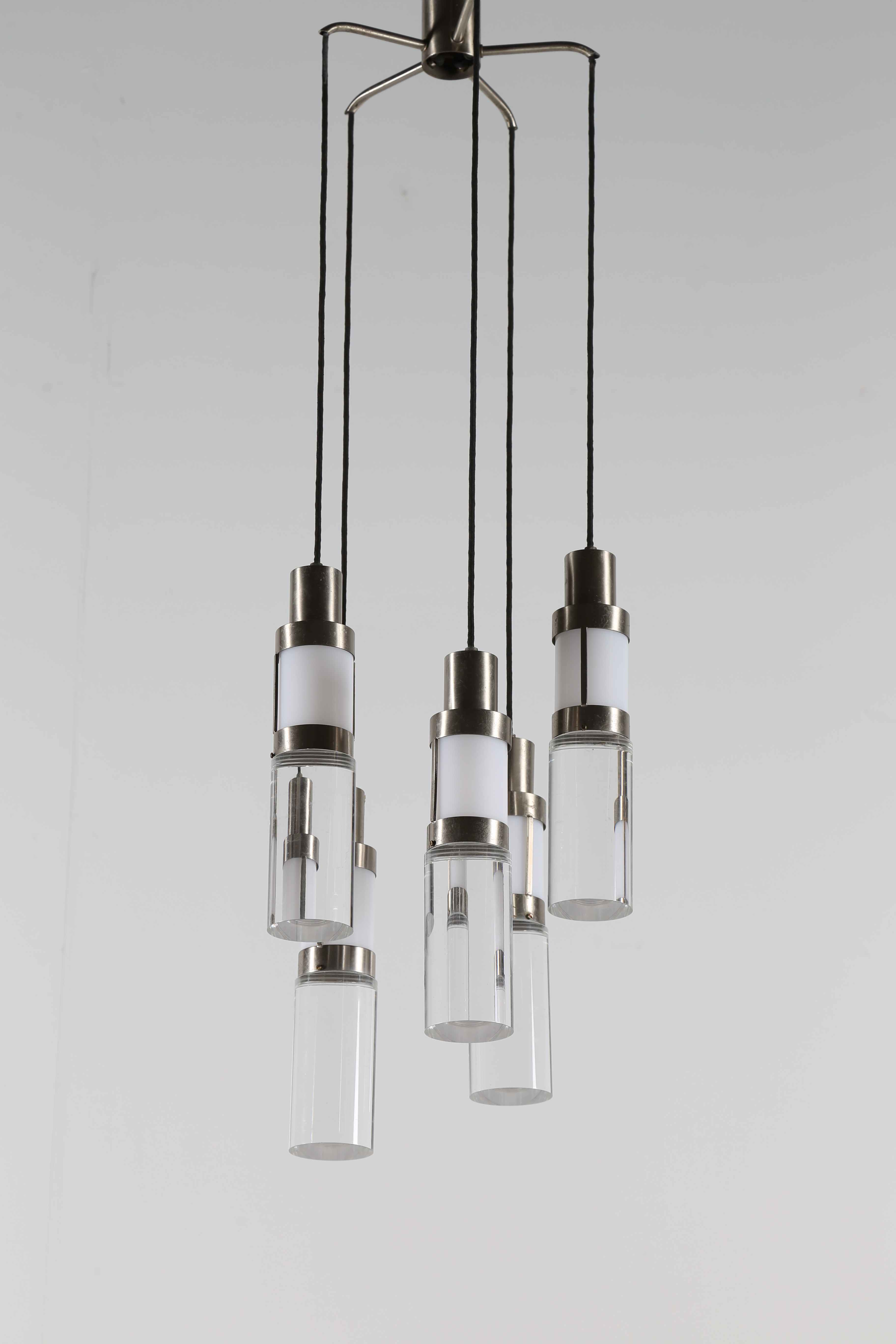 STILNOVO Lampadario a 5 luci. Plexiglass e ottone nichelato. Cm 45,00 x 145,00 x 45,00.