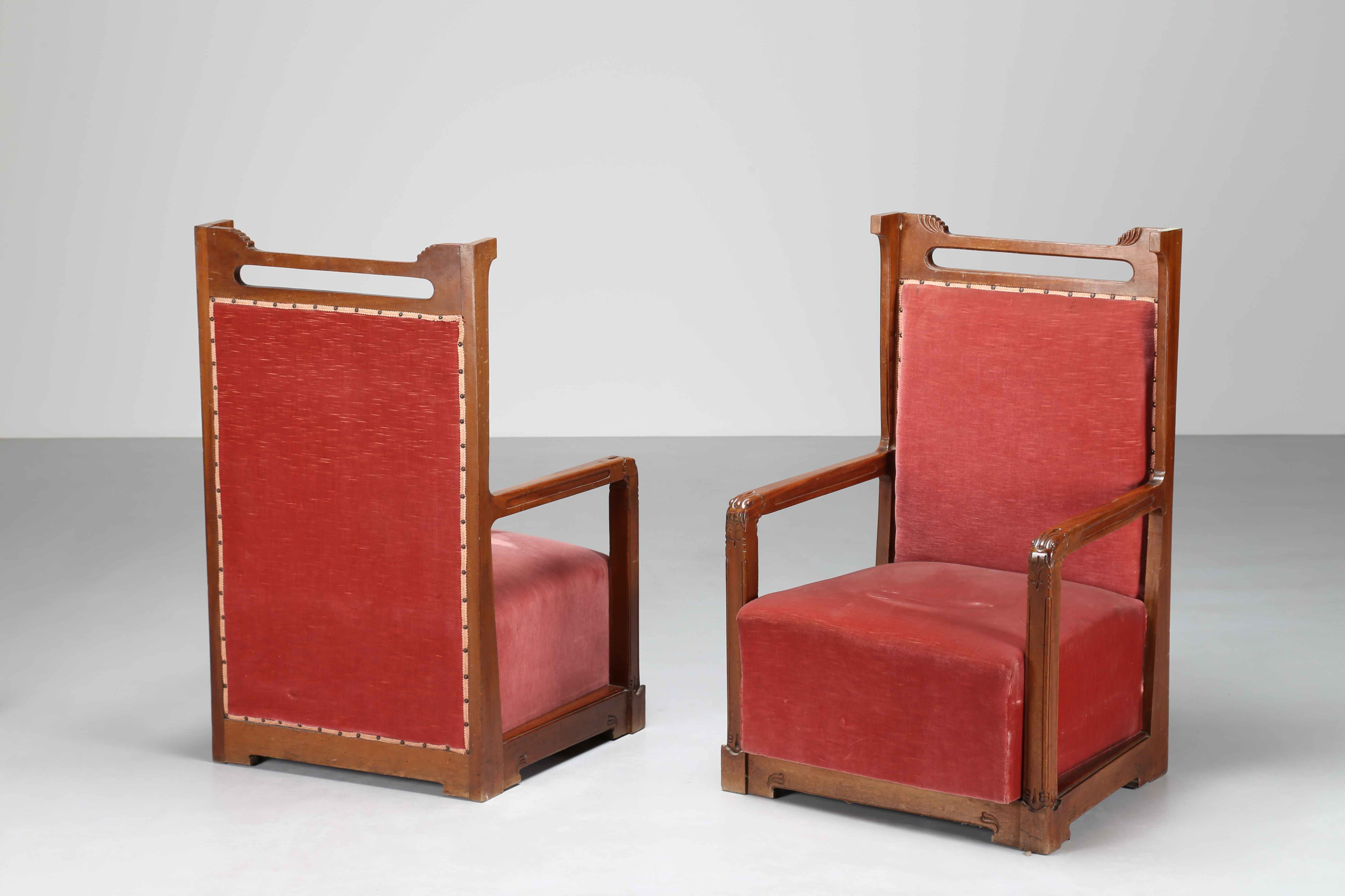 SELLO ANGELO Per Mobilificio G. Sello, Udine. Coppia di poltrone. Legno di noce e tessuto. Cm 70,00 x 110,00 x 66,00. 1910/1915.