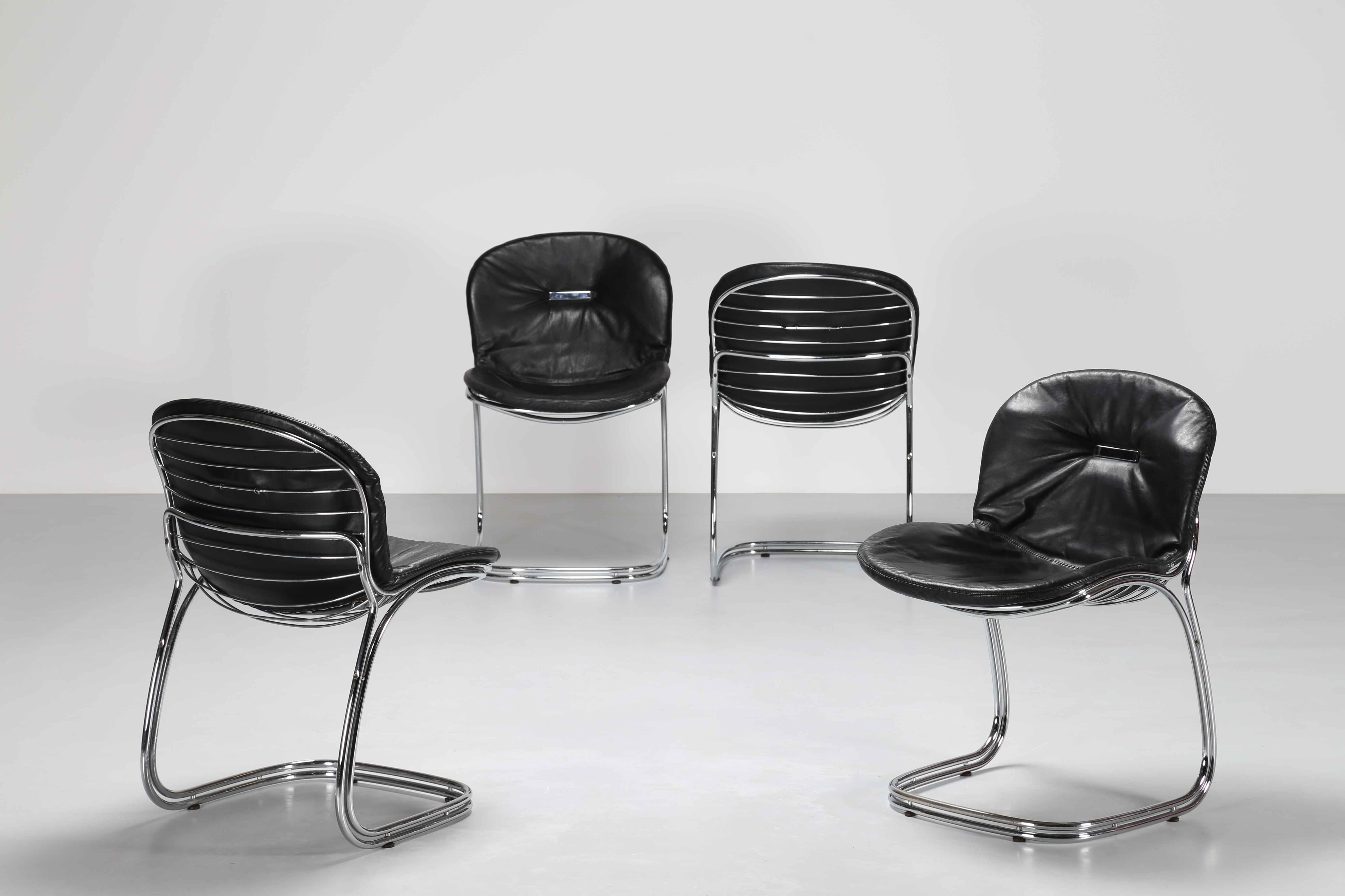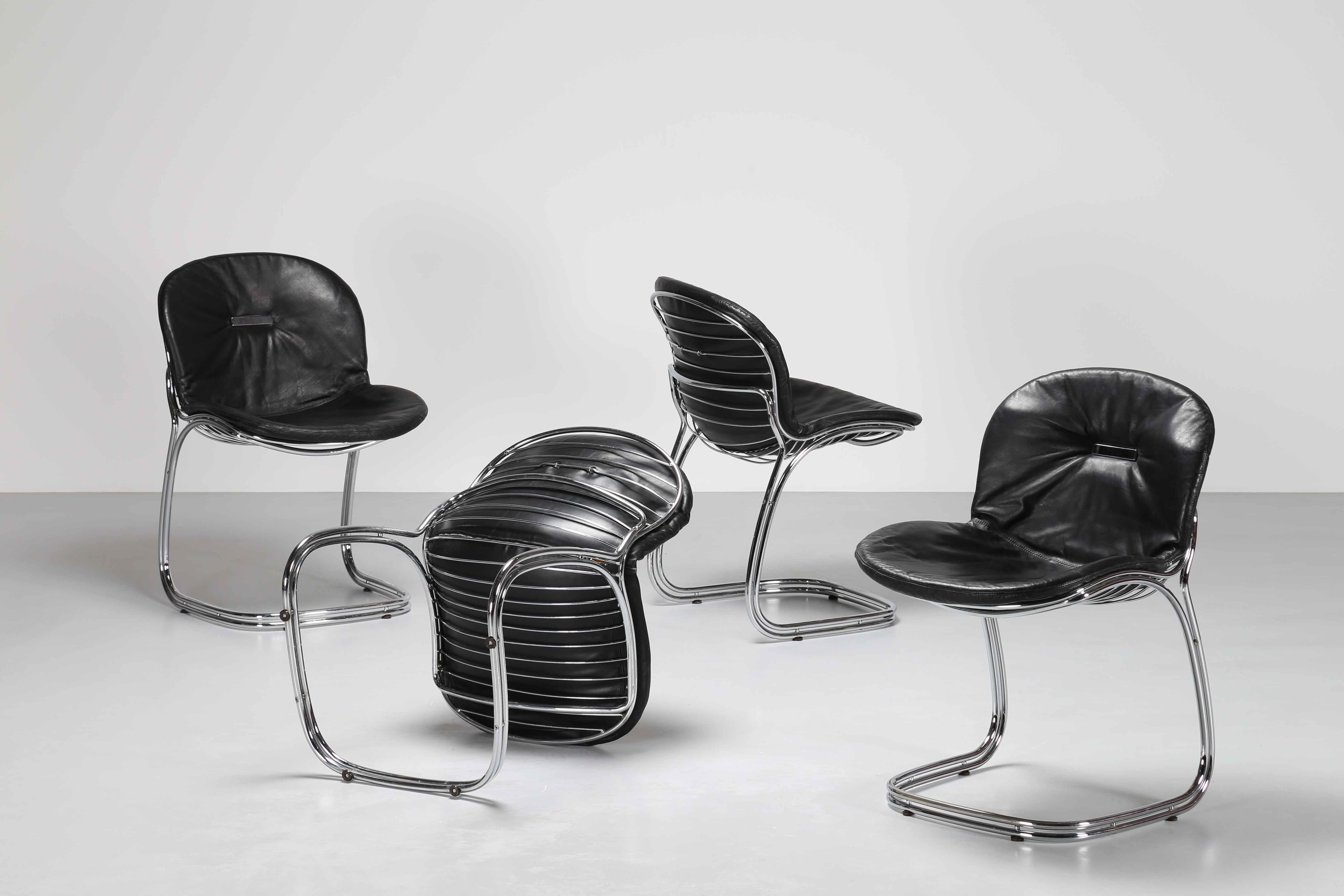 RINALDI GIORGIO Per RIMA. Lotto composto da n.4 sedie modello Sabrina. 1970. Acciaio e pelle. Cm 50,00 x 80,00 x 48,00. Pubblicazione: Catalogo Gastone Rinaldi - Designer per la RIMA a cura di Giuseppe e Jacopo Drago, pag.200.
