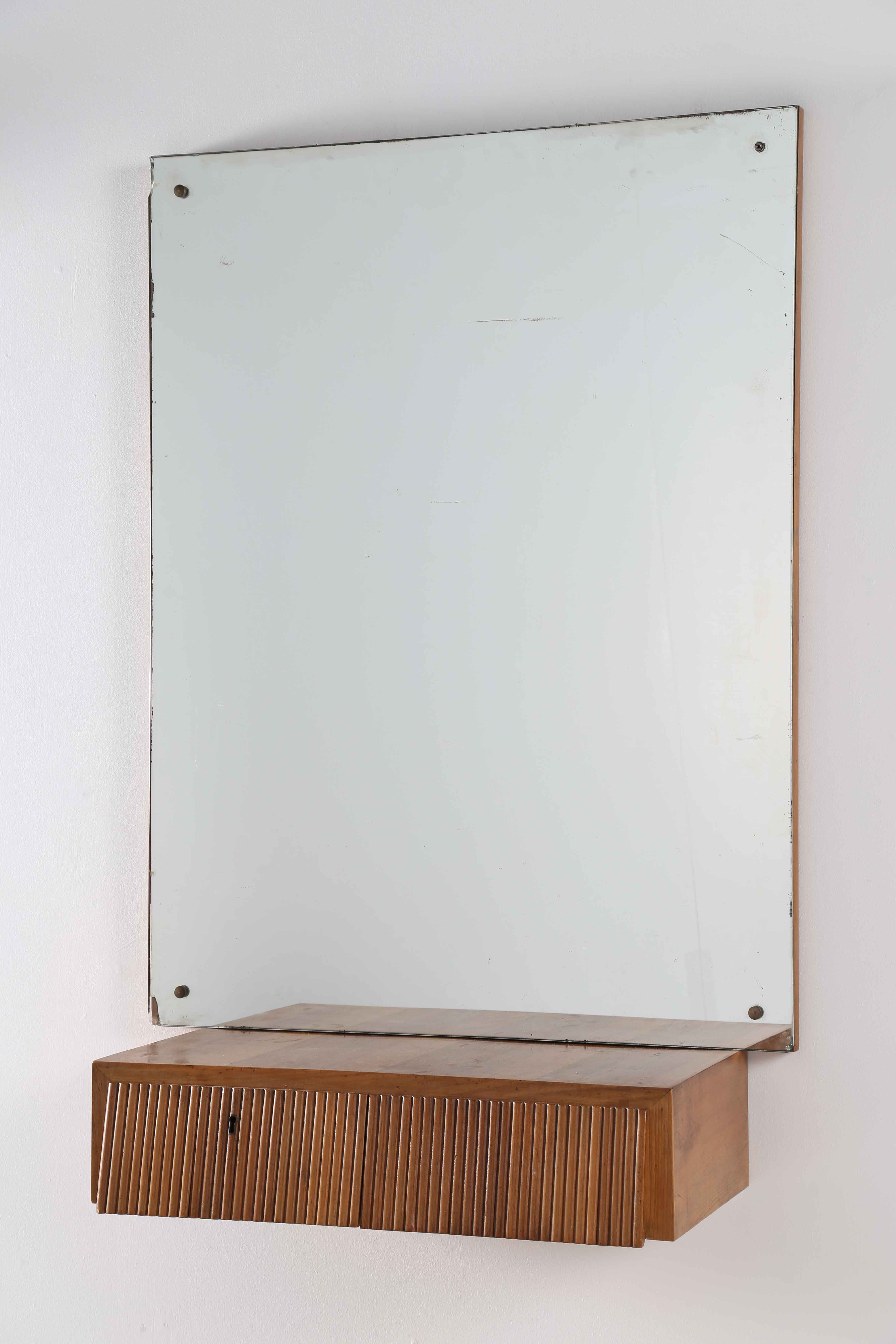 GIORDANI PIERLUIGI Toilette, mensola pensile in noce e specchio. Legno e vetro. Cm 62,50 x 15,00 x 32,00. Dimensione specchio: 75x100x3 cm. Eseguita per casa di Bologna nel 1954.