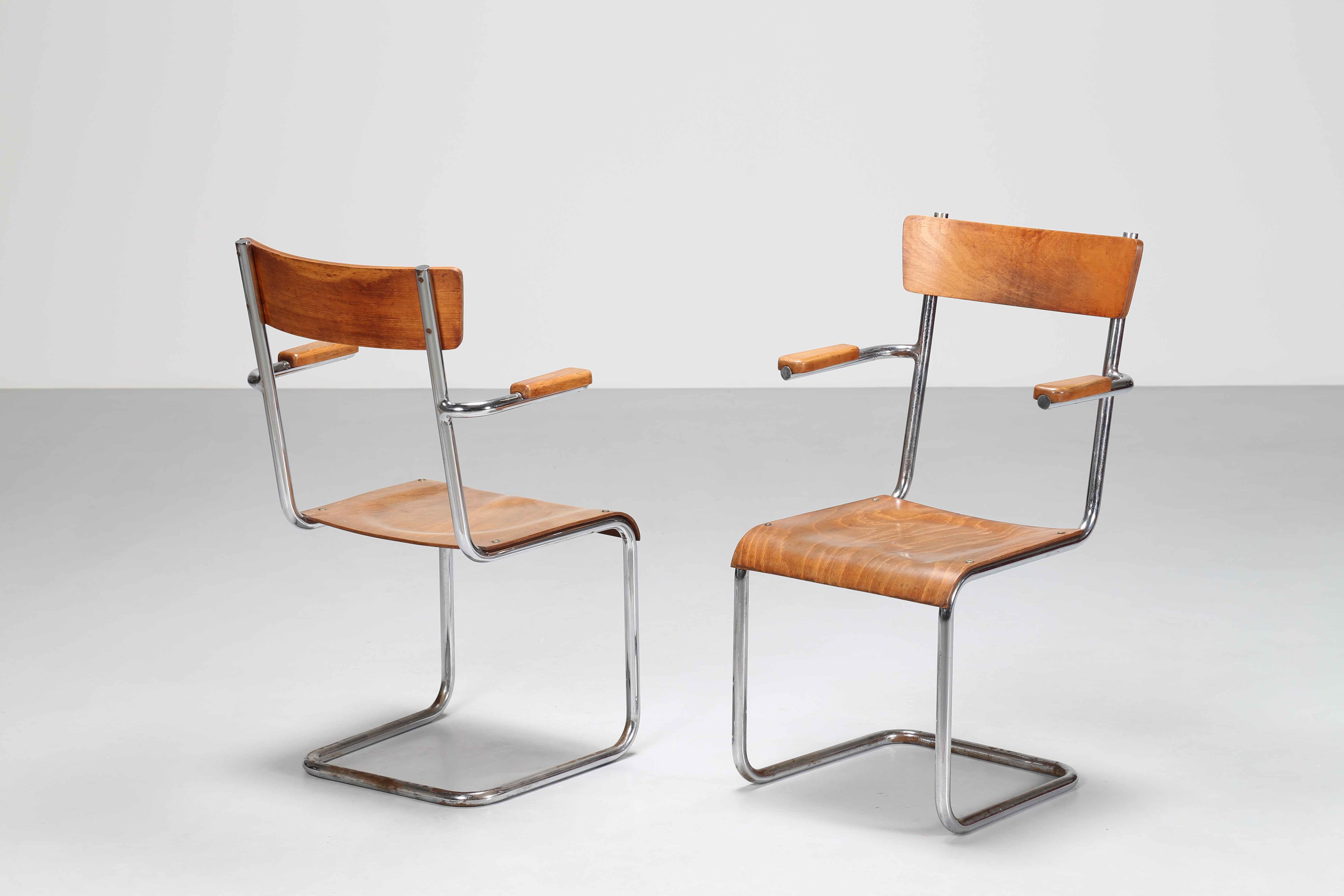 STAM MART Per Cova, Milano. Coppia di sedie. Metallo nichelato e legno. Cm 59,50 x 93,00 x 48,00. 1940/1950.